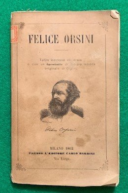 In 12°; 157, (3) pp. e 5 c. di tav. fuori testo compresa l'antiporta con ricostruzione dell'esecuzione di Felice Orsini. Brossura editoriale con titolo e ritratto di Felice Orsini al piatto anteriore. Qualche lievissima traccia di polvere al piatto anteirore, ininfluente. Le tavole fuori testo sono stampate su carta azzurra. Terza edizione con alcune aggiunte rispetto alle due precedenti dello stesso anno. Prima edizione con le 5 tavole al posto delle 3 tavole presenti nelle edizioni precedenti. L'opera è una delle più celebri biografie di Felice Orsini, mazziniano, che fu l'autore di un noto attentato rivoluzionario contro Napoleone III. Esemplare in buone-ottime condizioni di conservazione ed ancora in berbe.