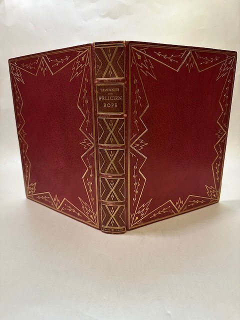 Bellissima legatura d'artista firmata Hubel & Denck - Leipzig in tutto marocchino rosso con impressioni decò ai piatti, dorso con nervi e fregi in oro stilizzati, contropiatti con bordura in pelle e motivi decorativi in oro, sguardie in seta nera, taglio superiore dorato, ottime condizioni. Conservata a fine volume la brossura editoriale illustrata. Edizione originale di una delle più famose ed importanti monografie su Félicien Rops. Con molte illustrazioni e tavole fuori testo (protette da velina).