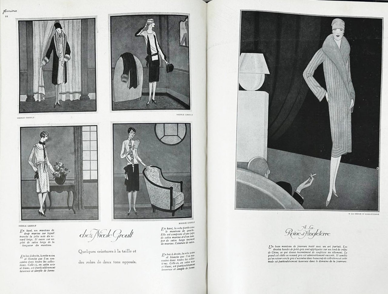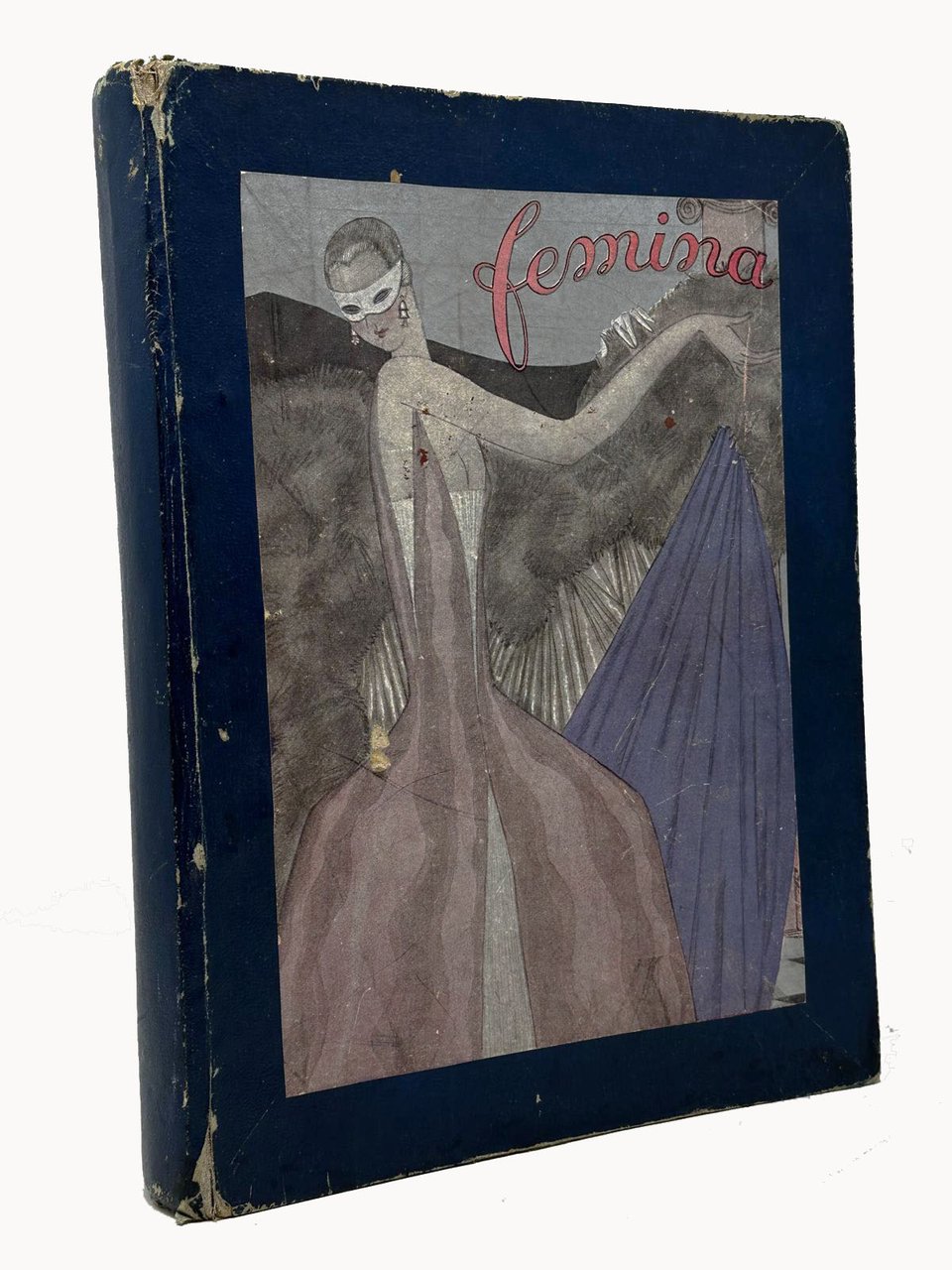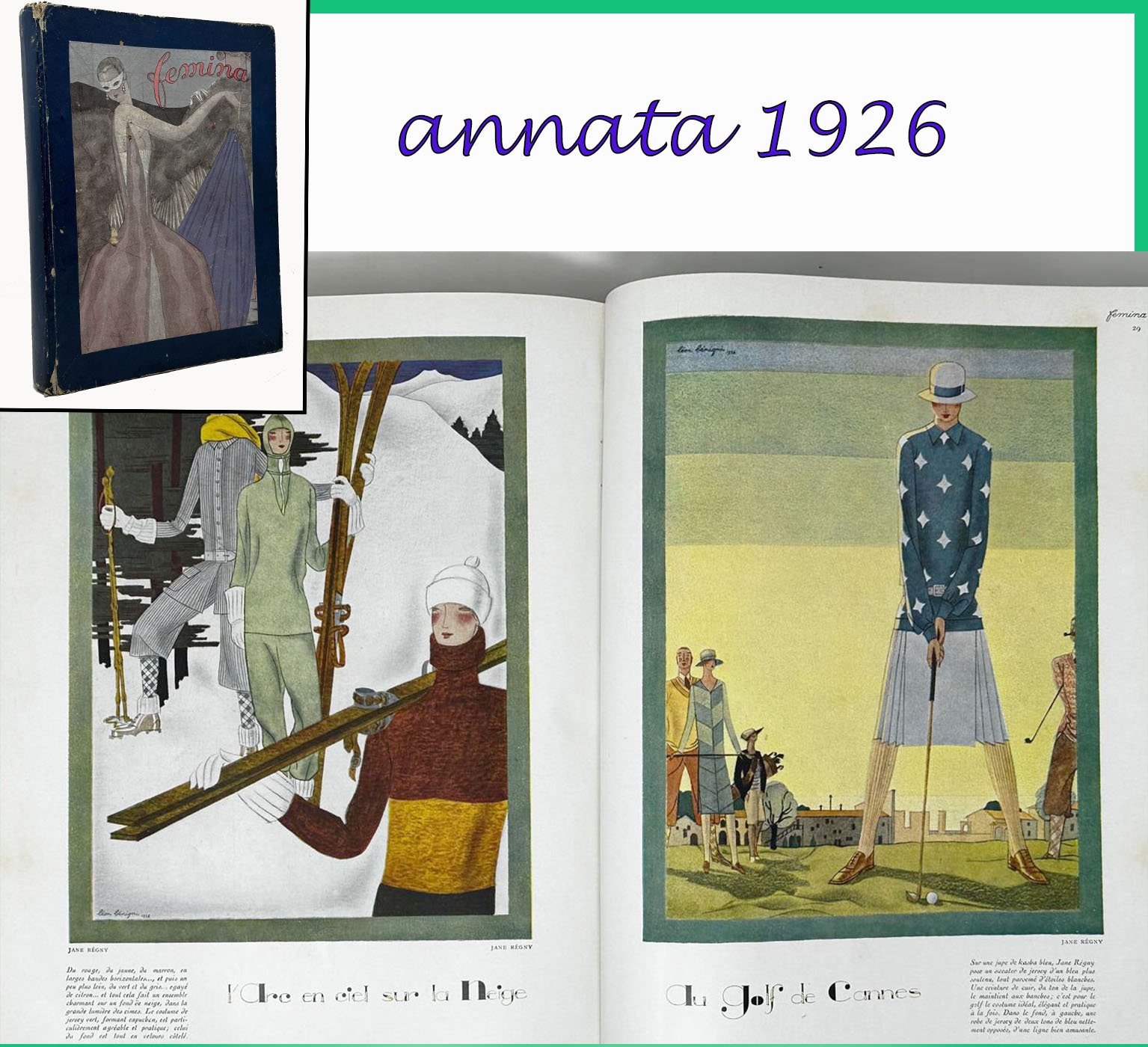 In un unico volume, di dimensioni, 24 x 32 cm circa, sono stati rilegati i 12 volumi dell'anno 1926 della celebre rivista francese di moda 'Femina' (annata completa). Directeurs: Pierre Lafitte, Robert Ochs. Redactrice en Chef de la Mode Martine Rénier. Lingua del testo: francese. Pagine (al netto delle inserzioni pubblicitarie): 40 (numero di gennaio); 40 (febbraio); 40 (marzo); 44 (aprile); 40 (maggio); 40 (giugno); 40 (luglio); 40 (agosto), 36 (settembre); 44 (ottobre); 40 (novembre) 44 (dicembre). Stato di conservazione: evidenti abrasioni e qualche segno d'usura sui piatti della copertina cartonata rigida utilizzata per la rilegatura (e altresì sulle immagini a colori applicate sui piatti). Tendenzialmente, all'interno della raccolta rilegata, sono conservate anche le copertine anteriori con eccezione del numero di gennaio (non presente) e del numero di dicembre (in quanto essa è stata scelta per essere ritagliata e incollata sul piatto anteriore della rilegatura cartonata). La copertina di febbraio è stata rilegata davanti alla prima pagina del numero di gennaio per cui il primo foglio del numero di febbraio segue, in maniera consecutiva, l'ultimo foglio del numero di gennaio. Si segnala la mancanza del foglio contenente le due pagine 13 e 14 del numero di marzo. In alcuni numeri sono presenti numerose pagine pubblicitarie illustrate mentre in altri no (resta il dubbio se fossero presenti in origine o se alcuni numeri, per scelta editoriale, ne fossero proprio sprovviste). Le pagine pubblicitarie presenti in questa raccolta, individuate con numeri romani, sembrano non seguire una sequenza logica (anche in questo caso non siamo in grado di definire se per scelta editoriale o a seguito della rilegatura). Si evidenzia altresì una marcata abrasione su parte dell'immagine (viso femminile) della copertina del numero di settembre e una piccola riparazione sull'angolo superiore sinistro del numero di giugno. i primissimi numeri presentano una leggera rifilatura del margine verticale che, però, non compromette le immagini o il testo (salvo che per l'indicazione del numero della pagina). una marcata piega sull'ultima pagina pubblicitaria Per il resto in buone condizioni di conservazioni con gli ordinari segni del tempo e dell'uso. Copertine a colori. Ciascun numero è riccamente illustrato con magnifici disegni di moda (nel tipico degli anni '20) e immagini fotografiche realizzate dai migliori fotografi del tempo si segnala, in particolare, Man Ray. Illustrazioni in nero ad eccezione di alcune tavole a colori nel numero di novembre e di dicembre. Oltre ad essere dedicata essenzialmente alla moda non mancano riferimenti allo spettacolo e ad altri eventi del tempo. Sezioni dedicate, nello specifico, alla moda nel campo sportivo. Particolare rilievo alla moda correlata al mondo dell'automobile. Rilegatura cartonata rigida con copertina a colori applicata ai piatti. Numerosi i disegni raffiguranti modelli di abiti dei grandi stilisti del tempo quali, ad esempio, Jean Patou, Chantal, Doucet, Fourrures Max, Jenny, Lucien Lelong, Callot, Rodier, Vionnet, Lewis, Le Monnier, Cartier, Goupy, Martial et Armand, Gina-Mary, Charlotte, Reboux, Hermès, Redfern, Goupy, Philippe et gaston, Chanel, Drecoll