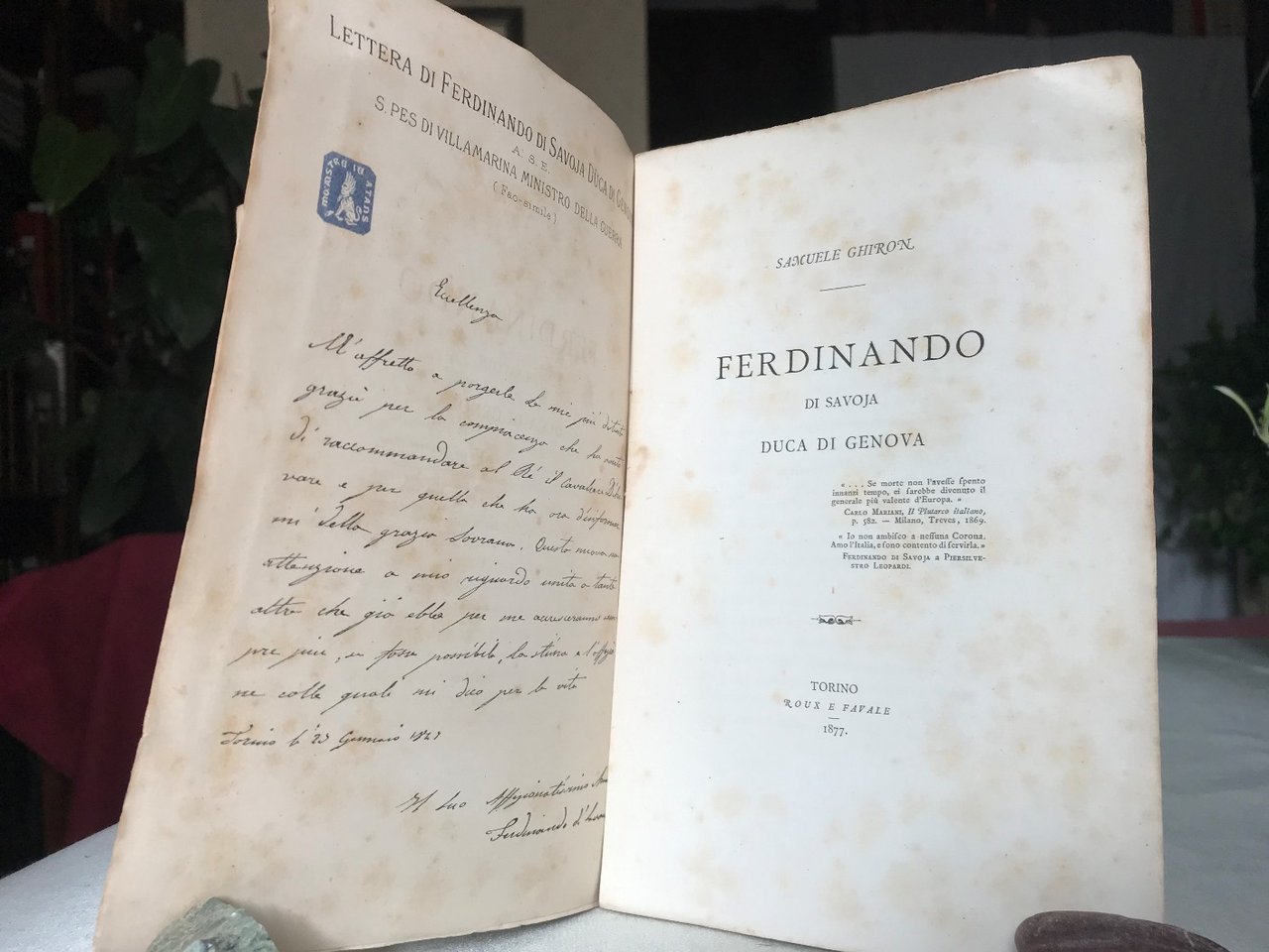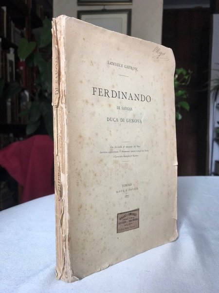 Volume in 8, brossura editoriale, titolo al piatto ed al dorso (strappetti e mancanze), bianca, occhiello, tavola dantiporta con facsimile di lettera autografa del duca al Ministro della Guerra, frontespizio, prefazione, VIII, 291 pp., 3 tav. f.t. (Monumento equestre erettogli in Torino e carta della battaglia di Novara). Un excursus storico pi che biografico, interessante e di piacevole lettura, ricco di aneddoti, annotazioni e richiami bibliografici, a rappresentare degnamente la figura di Ferdinando di Savoia, primo duca di Genova, generale dell'esercito del regno di Sardegna, fu, nel 1848, nominato re del governo secessionista di Sicilia (con il nome di Amedeo Alberto I), ma rinunci a tale nomina preferendo non abbandonare l'esercito piemontese. Impegnato nella prima guerra d'indipendenza, merit la medaglia d'oro. Tranne che per le citate mende al dorso che comportano una legatura in parte lenta, il volume in buono stato. Stampato a grandi margini su carta di buona qualit, con rare inevitabili fioriture. Ormai poco comune.