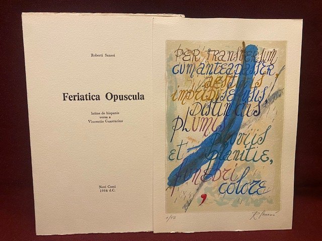Poesie in spagnolo di Roberto Sanesi tradotte da Vincenzo Guarracino. Con una scrittura visiva in serigrafia di R. Sanesi numerata e firmata 1/50. Prima edizione di 50 esemplari. Quartini sciolti in cartellina rigida in carta decorata e titolo in verticale su tassello in pelle al dorso. Ottima copia. Sc. F.