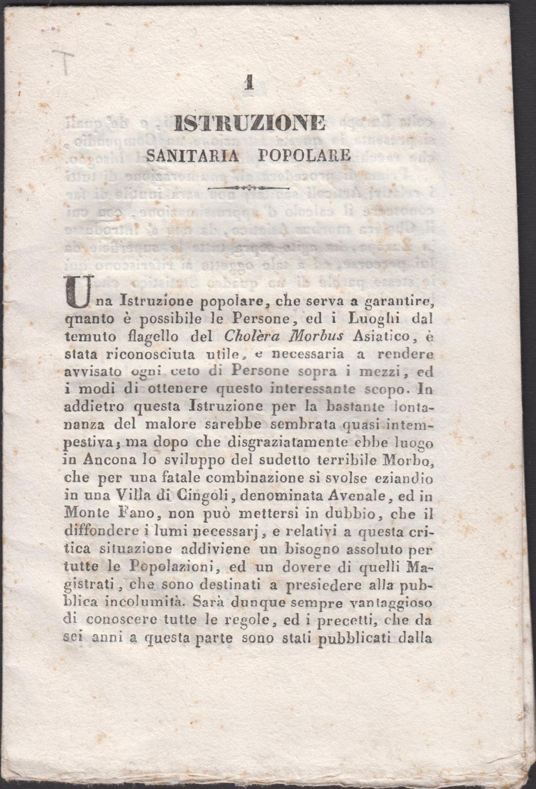 Opuscolo stampato a Fermo sulle istruzioni santirarie per il popolo, manca la copertina in buono stato ieri fioriture alle pagine, a fogli chiusi, numero parli 13 dimensioni cm 22 x 15