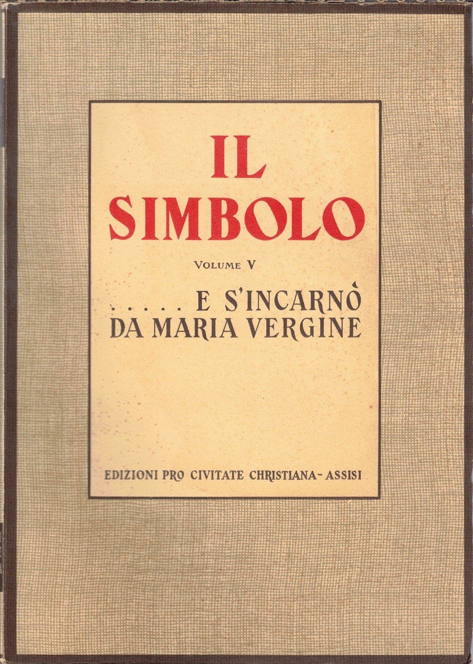 Ferrabino et al., Il simbolo. Volume V… E s’incarnò da Maria Vergine. Lezioni tenute ad Assisi al quinto corso di studi cristiani, Edizioni Pro Civitate Christiana, Assisi 1948, pp. 222, cm 25, br. ed. Indice: Giovanni Rossi, Prefazione – Aldo Ferrabino, L’esigenza della salvezza – Carlo Bo, Necessità e senso di partecipazione – Piercarlo Landucci, L’Immacolata – Raffaele Baratta, La Verginale Maternità di Maria – Giuseppe Messina, La Natività di Gesù nel Vangelo – Giulio Quirino Giglioli, La Natività di Gesù nell’archeologia – Mario Bendiscioli, La fede nell’Incarnazione – Piero Bargellini, Il Cristo nell’arte – Piero Parente, Il Verbo si fece carne e abitò fra noi – Alessandro Pernitzky, Il culto della Madonna nel mondo orientale – Giovanni B. H. Wu, Il culto della Madonna in Cina – Giuseppe Bettiol, Pace in terra agli uomini di buona volontà – Adeodato Piazza, L’Assunzione della Madonna. Lievi tracce d’uso alla brossura, leggere fioriture ai tagli, tenue brunitura della carta, per il resto ottimo esemplare.