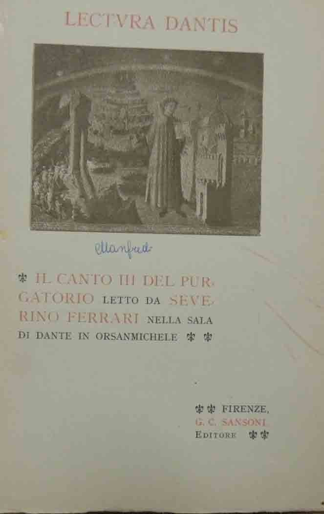 Il Canto III del Purgatorio letto da Severino Ferrari nella Sala di Dante in Orsanmichele, G. C. Sansoni Editore, Firenze 1931, pp. 46, ill. b.n., cm 24, br. ed. Collana Lectura Dantis. Testo della lettura effettuata nella Sala di Dante in Orsanmichele il 31 gennaio 1901. Tracce d’uso alla brossura, con una piccola annotazione a biro alla prima di copertina e dorso restaurato e con piccolissime mancanze, lieve ingiallitura della carta, qualche sporadica sottolineatura a pastello, ma nel complesso esemplare in buono stato di conservazione.