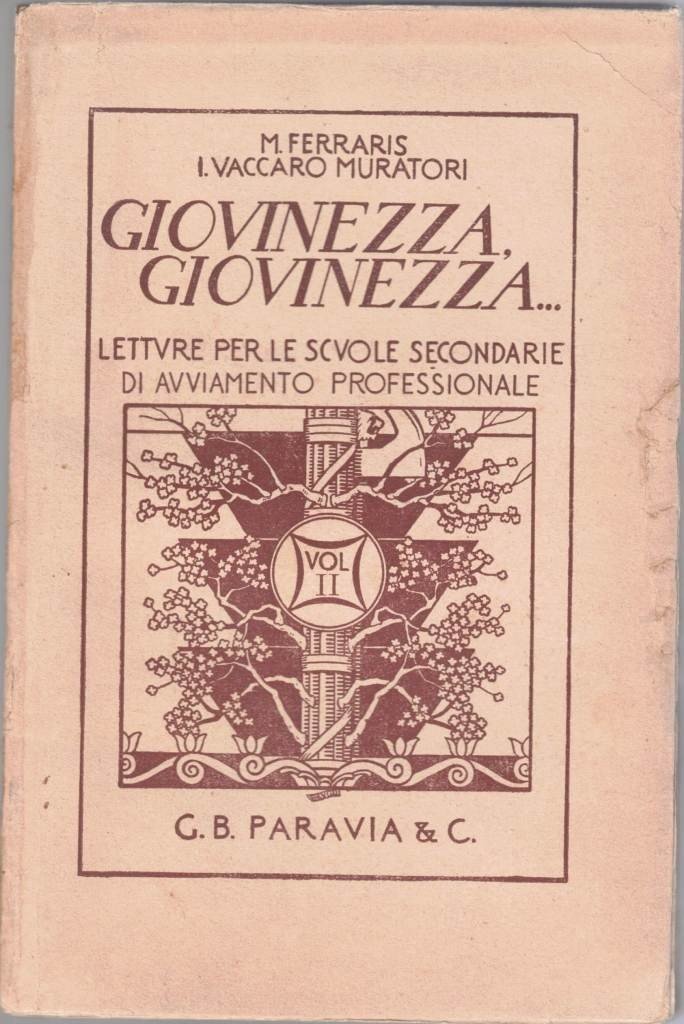 M. Ferraris, I. Vaccaro Muratori, Giovinezza, giovinezza… Letture per le scuole secondarie di avviamento proessionale. Volume secondo, G. B. Paravia e C., Torino 1935, pp. 240, cm 21, br. ed. Tracce d’uso alla brossura con abrasioni e vecchio restauro al dorso, minima traccia di gora di modestissima estensione al taglio superiore, per il resto lieve brunitura della carta, ma nel complesso ancora buona copia, ben tenuto e intonso l’interno. Non comune.