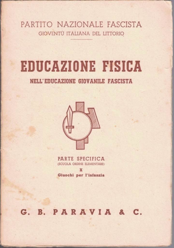 Eugenio Ferrauto, Educazione fisica nell’educazione giovanile fascista. Parte specifica (Scuola Ordine Elementare). X. Giuochi per l’infanzia, G. B. Paravia e C., Torino 1940, pp. 67, ill. b.n., cm 20, br. ed. Collana Educazione fisica nell’educazione giovanile fascista. Parte specifca. Per il programma della Scuola Elementare, vol. X. In testa alla prima di copertina: Partito Nazionale Fascista – Gioventù Italiana del Littorio. Qualche sporadica sottolineatura a lapis, minime fioriture, per il resto ben conservato.