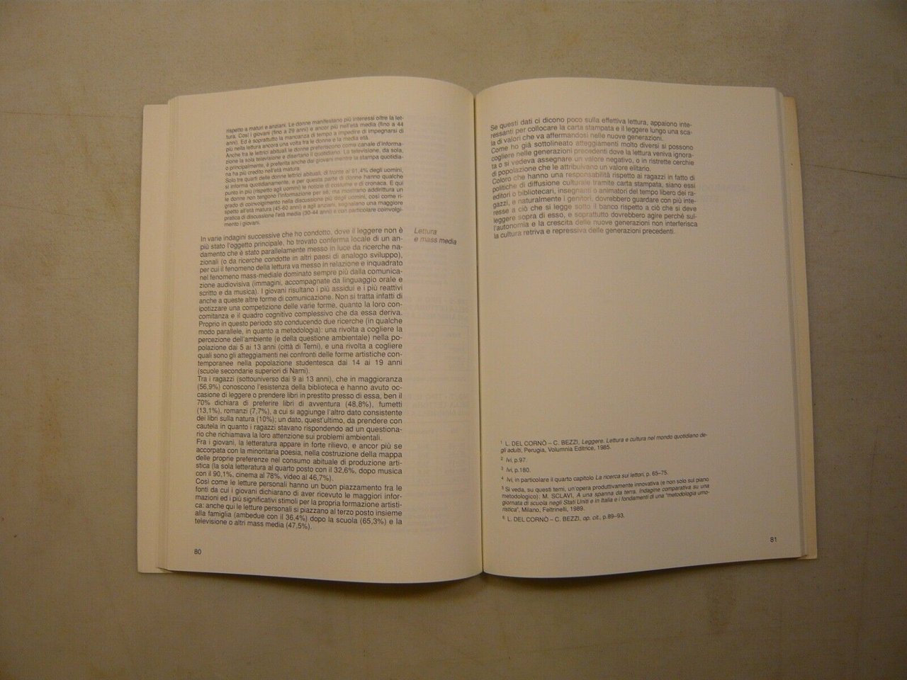 Indice generale:-Presentazione-Libri e Lettori: considerazioni in premessa-Piacere alla lettura: Scuola e biblioteca a confronto-Le cifre della lettura: produzione, mercato, consumo-Informazione bibliografica: la parola alle riviste-Voci dal Nord-Est