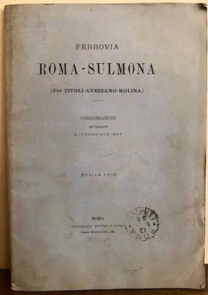 8vo (cm. 23), 56 pp. Con una grande carta litografica più volte ripiegata in fine (’Corografia della ferrovia in progetto Roma-Sulmona’). Brossura editoriale. Ottimo esemplare. Timbretto ferroviario sulla cop. anteriore.