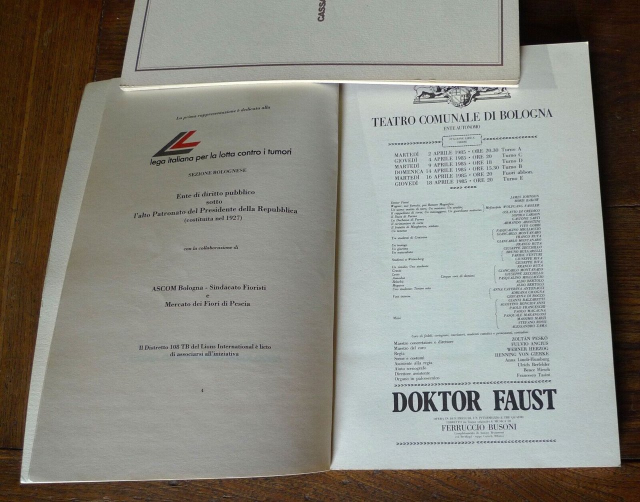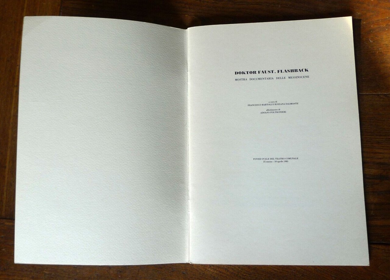 - DOKTOR FAUST. FLASHBACK.MOSTRA DOCUMENTARIA DELLE MESSINSCENEa cura di Francesco Bartoli e Rossana Dalmonte.Foyer ovale del Teatro Comunale,25 marzo - 18 aprile 1985Edizioni del Teatro Comunale,dirette da Franco Varini, Bologna 1985,brossura, 27x18,5 cm., pp.35,illustrazioni in bianco e nero,peso: g.150