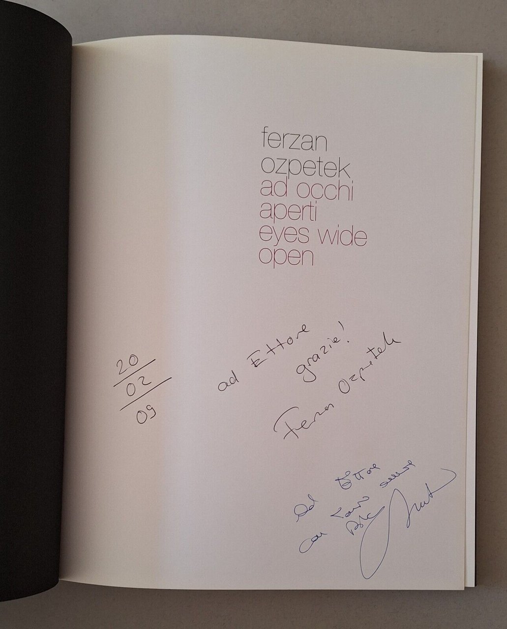 FERZAN OZPETEK AD OCCHI APERTI MONDADORI 2008In 4°, legatura editoriale, copertina illustrata, ill. a colori.Copia con dedica autografa di Ozpetek e Ambra Angiolini. Fotografie applicate di Ozpetek e Ambra Angiolini alle sguardie.Lievissimi segni alla copertina.