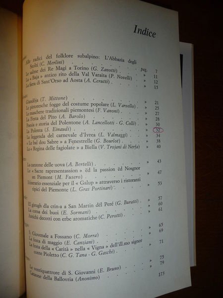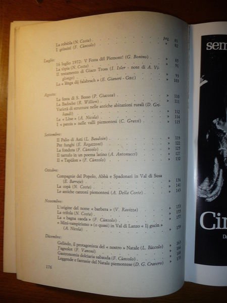 DESCRIZIONE: Famija Turineisa Turin 1972, br. ed. pp. 176 più varie di pubblicità ad inizio e fine vol. in 8°. Per ogni mese dell'anno, raccolta di brani e rime di vari autori (alcune in piemontese) dedicate a sagre e feste popolari. Indice completo in foto. CONDIZIONI: Discrete/Buone, tracce di sporco, vol. con timbro di biblioteca estinta. Perfetto all'interno, con pagina dell'indice incollata con scocth. PESO / WEIGHT: 468 gr. without package