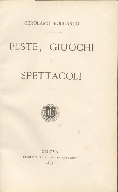 2ª edizione. Cm.19,5x12,3. Pg.428. Legatura in mz.tela con titoli impressi in argento al dorso e piatti marmorizzati. . Opera abbastanza anomala nel quadro della produzione dell'economista genovese (1829-1904) che ripercorre l'evoluzione delle attività ludiche e di spettacolo dall'antichità sino al XIX secolo, con particolare riguardo alle feste tradizionali. Il tema viene affrontato sotto numerosi punti di vista, dall'aspetto sportivo alla caccia, dalla danza alla prestidigitazione, dal carnevale alla musica, dal gioco d'azzardo all'uso di sostanze alcoliche e tabacco, etc. > Pitré, 3596, "Comprende 148 numeri". Codice libreria 139204.