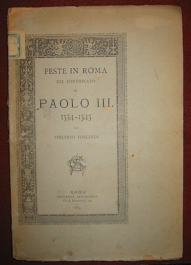 8vo (cm. 26), 116 pp. Frontis. figurato che riporta il seguente, diverso, titolo: Tornei e Giostre - Ingressi Trionfali e Feste Carnevalesche in Roma sotto Paolo III’. Testo entro belle cornici xilografiche, fregi n.t. e iniziali ornate. Bross. ed. con alcune mancanze e quasi priva del ds., parzialmente aperto. Buoni interni. Ex libris araldico.