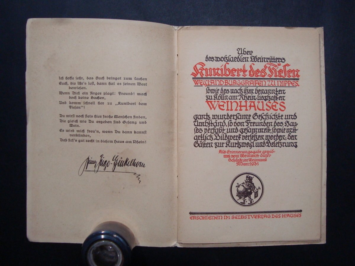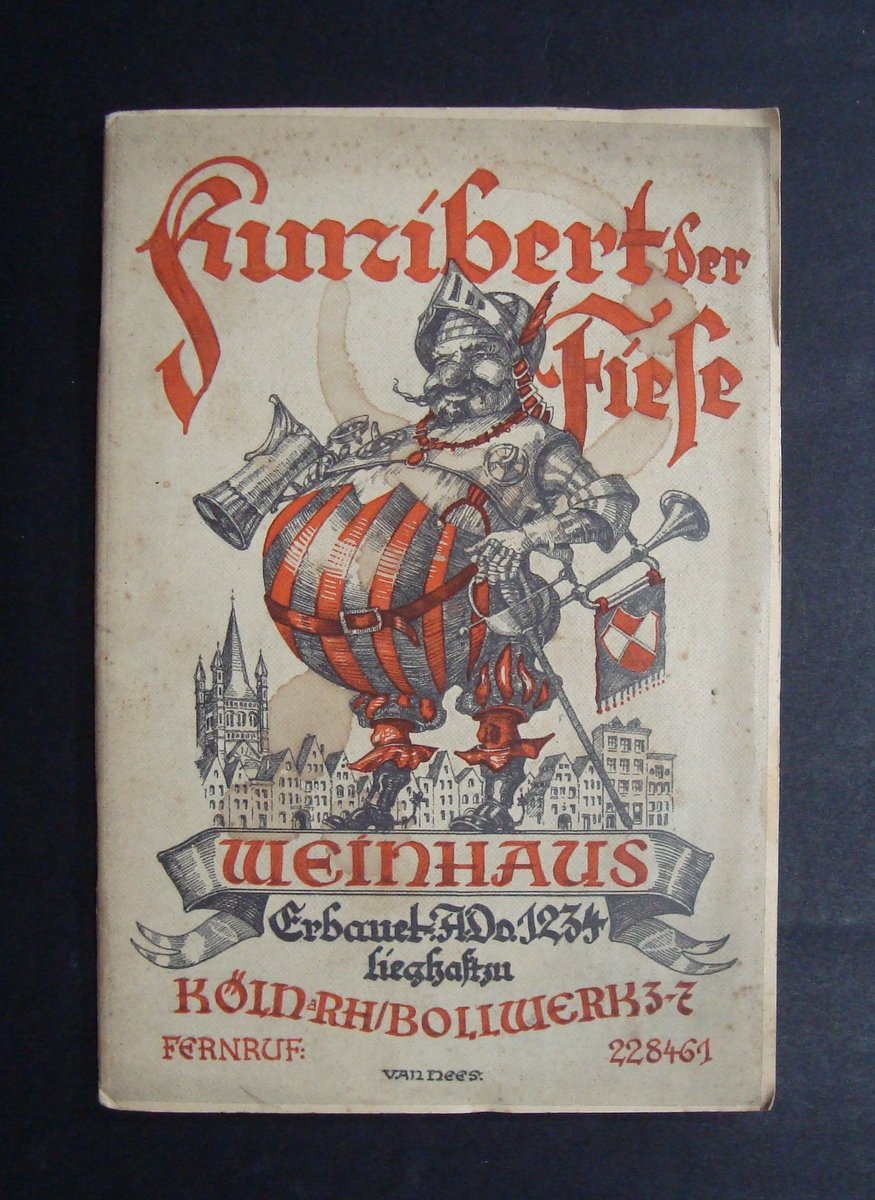 Brossura, KUNIBERT DER FIESE WEINHAUS KOLN RH/BOLLWERK 3-7 Druckerei Beyer & Schmeisser, Koln, s.d.(anni '30), cm 17 x 12, con ill.fot.b/n., bella grafica Condizioni di conservazione. buono stato con leggere tracce d'uso e del tempo. brossure con alcune piccole macchiette. OPEB.2938 BLU