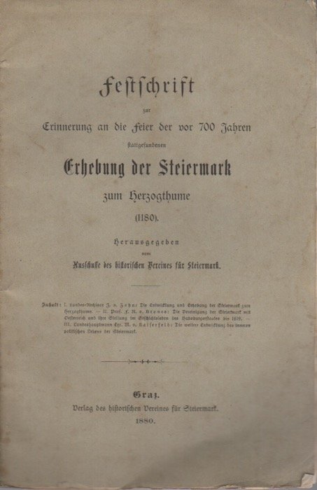 Festschrift zur Erinnerung an die Feier der vor 700 Jahren stattgefundenen Erhebung der Steiermark zum Herzogthume (1180).