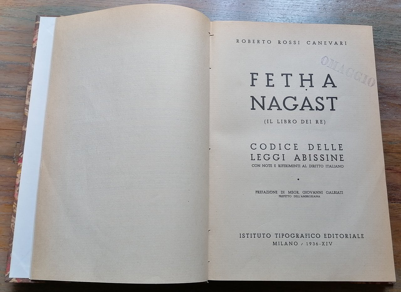 (Abissinia; Etiopia; Etnologia; Colonialismo italiano; Fetha Neghèst; Codice ecclesiastico e civile d'Abissinia; Diritto etiopico) In 8°, legatura in mezza pelle ocra chiaro, al dorso filetti e titoli impressi in oro, carta marmorizzata ai piatti, pp. XV,(1),314,(6). Prefazione di mons. Giovanni Galbiati Prefetto dell'Ambrosiana. Timbro di omaggio dell'editore al frontespizio. Dedica autografa dell'autore al recto della prima carta bianca. Ottimo stato di conservazione.