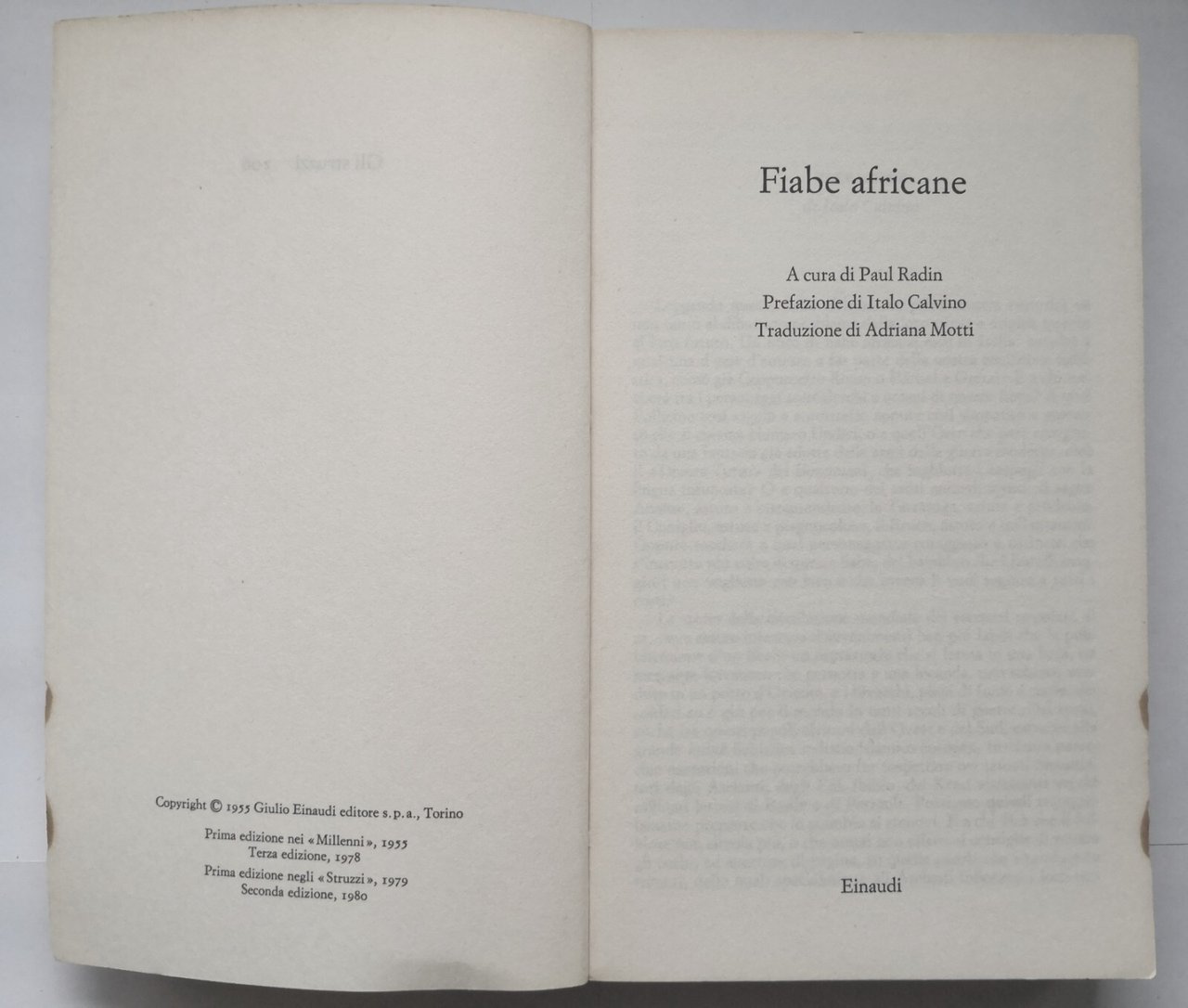 FIABE AFRICANE a cura di Paul Radin 1980 Einaudi prefazione Italo Calvino libro