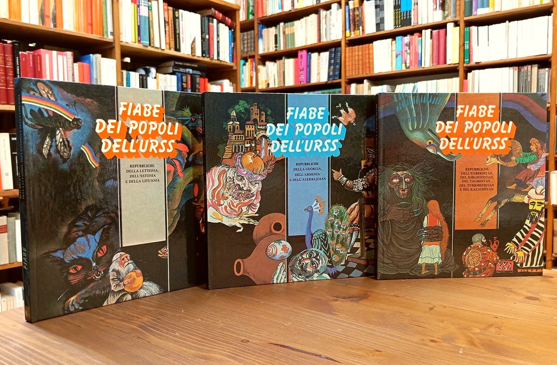 Lotto di tre dei cinque volumi della serie "Fiabe dei popoli dell'URSS". Nel dettaglio: a) REPUBBLICHE DELLA LETTONIA, DELL'ESTONIA E DELLA LITUANIA, 144 pagine, trad. di Alberto Prefumo - b) REPUBBLICHE DELLA GEORGIA, DELL'ARMENIA E DELL'AZERBAJGIAN, 144 pagine, trad. di Alberto Prefumo - c) REPUBBLICHE DELL'UZBEKISTAN, DEL KIRGHIZISTAN, DEL TAGIKISTAN, DEL TURKMENISTAN E DEL KAZACHSTAN, 192 pagine, trad. di Angelo Sollano. Copertine rigide editoriali, numerose illustrazioni a colori; scelta dei testi di Robert Bablojan e Mirlena Sumskaja. Indici delle favole consultabili nelle nostre immagini. Sottili tracce di nastro adesivo rimosso alle sguardie dei volumi, ordinari segni d'uso, tenui e sporadiche fioriture; nel complesso esemplari in ottimo stato di una collana non comune.