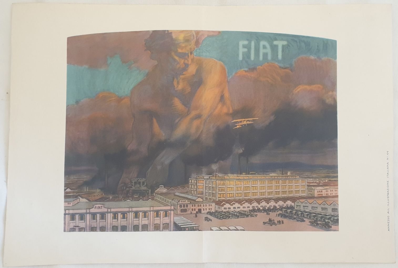 Pubblicità degli anni '30 del novecento dell'azienda Fiat. Di grandi dimensioni. Carta spessa. In buone condizioni. Dimensoni foglio: 40x59 cm. Dimensoni incisione: 31,5x42 cm. Advertising of 1930's of Fiat firm. Of big size. Wide paper In good conditions.Size of the page: 40x59 cm. Size of the illustration: 31,5x42 cm.