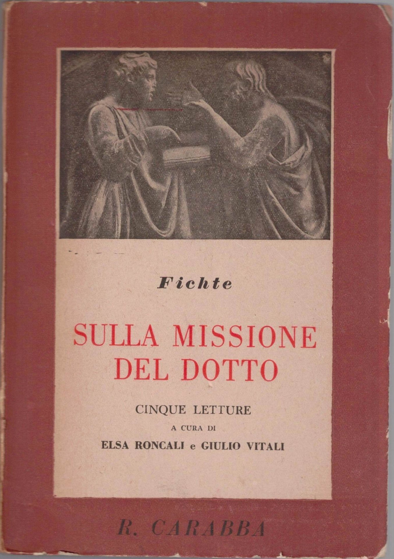 Giovanni Amedeo (Joahann Gottlieb) Fichte, Sulla missione del dotto. Cinque letture, prefazione di Giulio Vitali, traduzione di Elsa Roncali, Casa Editrice R. Carabba S/A, Lanciano-Roma 1948, pp. 125, cm 19, br. ed. Collana Classici del pensiero e dell’educazione, vol. 3. Indice: Prefazione di Giulio Vitali – Lettura prima. Sul destino dell’uomo in sé – Lettura seconda. Sulla missione dell’uomo nella società – Lettura terza. Sulla diversità delle classi nella società – Lettura quarta. Sulla missione del dotto – Lettura quinta. Critica delle affermazioni del Roussea intorno all’influenza delle arti e delle scienze sul benessere dell’umanità. Leggere tracce d’uso alla brossura, lieve brunitura della carta, per il resto buona copia.