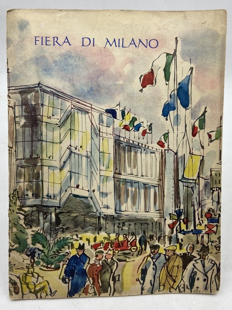 Brossura editoriale illustrata con risvolti, spillato, cm 23 x 17, pp 16 illustrate a colori. Opuscolo promozionale dell’Ente Fiera milanese, con illustrazioni a colori da acquerelli di Mario Vellani Marchi (inclusa la grande tavola che comprende entrambi i piatti e i risvolti della brossura) con vedute dei padiglioni e della città. Stampato da Amilcare Pizzi, l’opuscolo non porta data al colophon; il testo cita l’edizione 1956 della Fiera, gli acquerelli sono datati 1955.