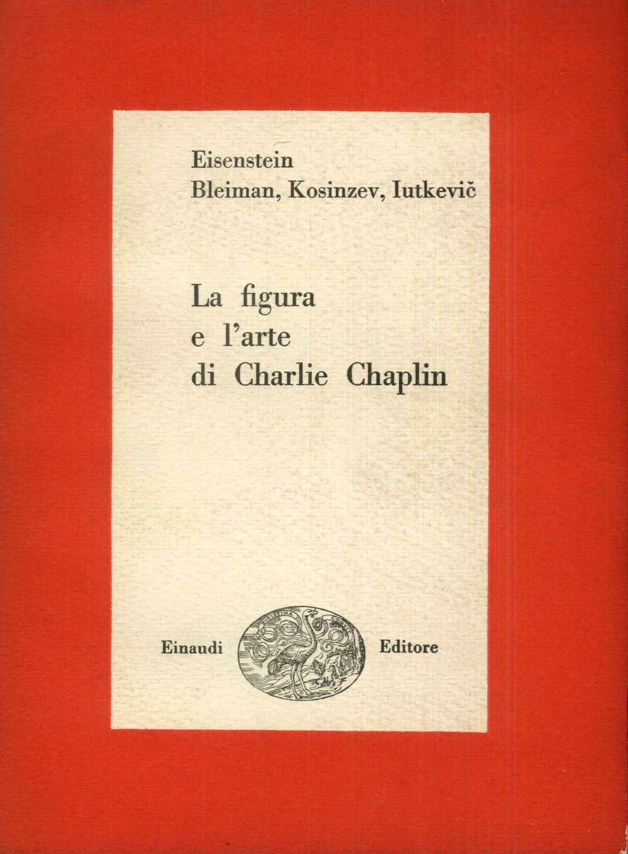 Einaudi, Torino, 1949. In-8°, pp. 240, brossura editoriale bicroma con velina protettiva. Numerose tavv. fotografiche f.t., di cui una all'antiporta. Ottimo stato. Prima edizione italiana di questi scritti su Chaplin di Ejzenstein, Bleiman, Kozincev e Iutkevic. Contiene anche numerosi scritti di Chaplin su se stesso e sull'arte del film. Filmografia chapliniana in appendice. Saggi, 116.