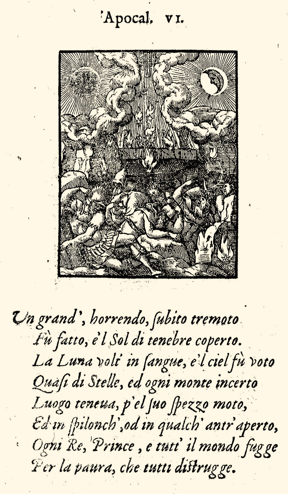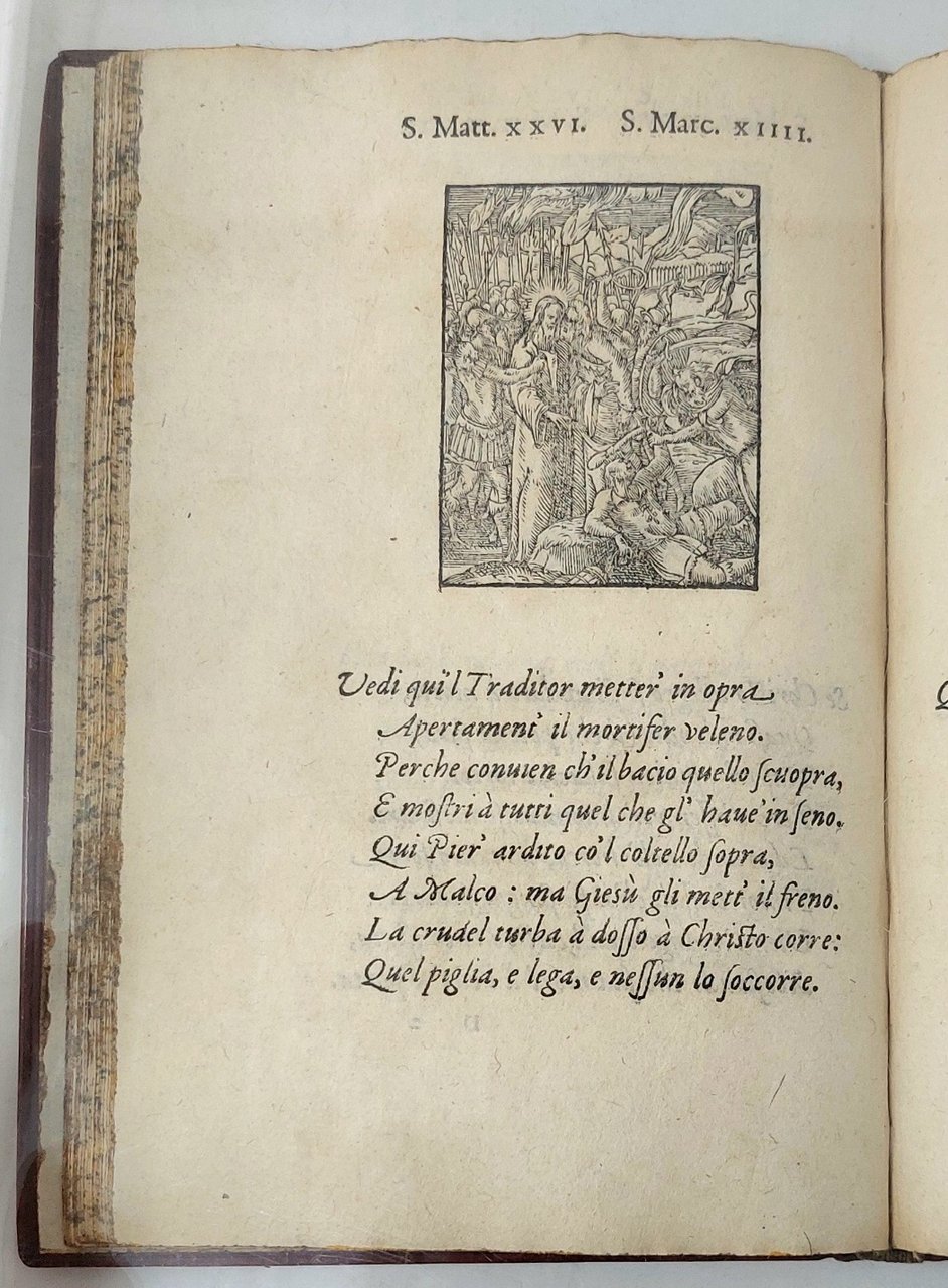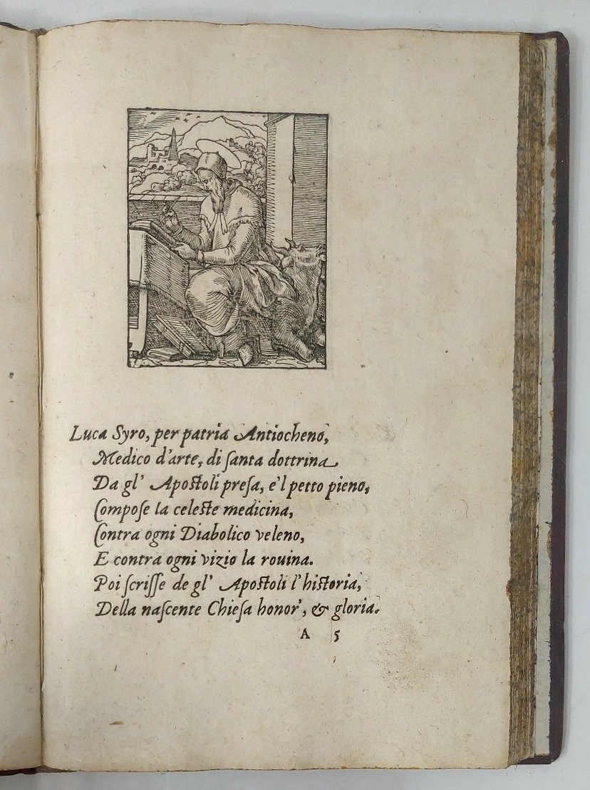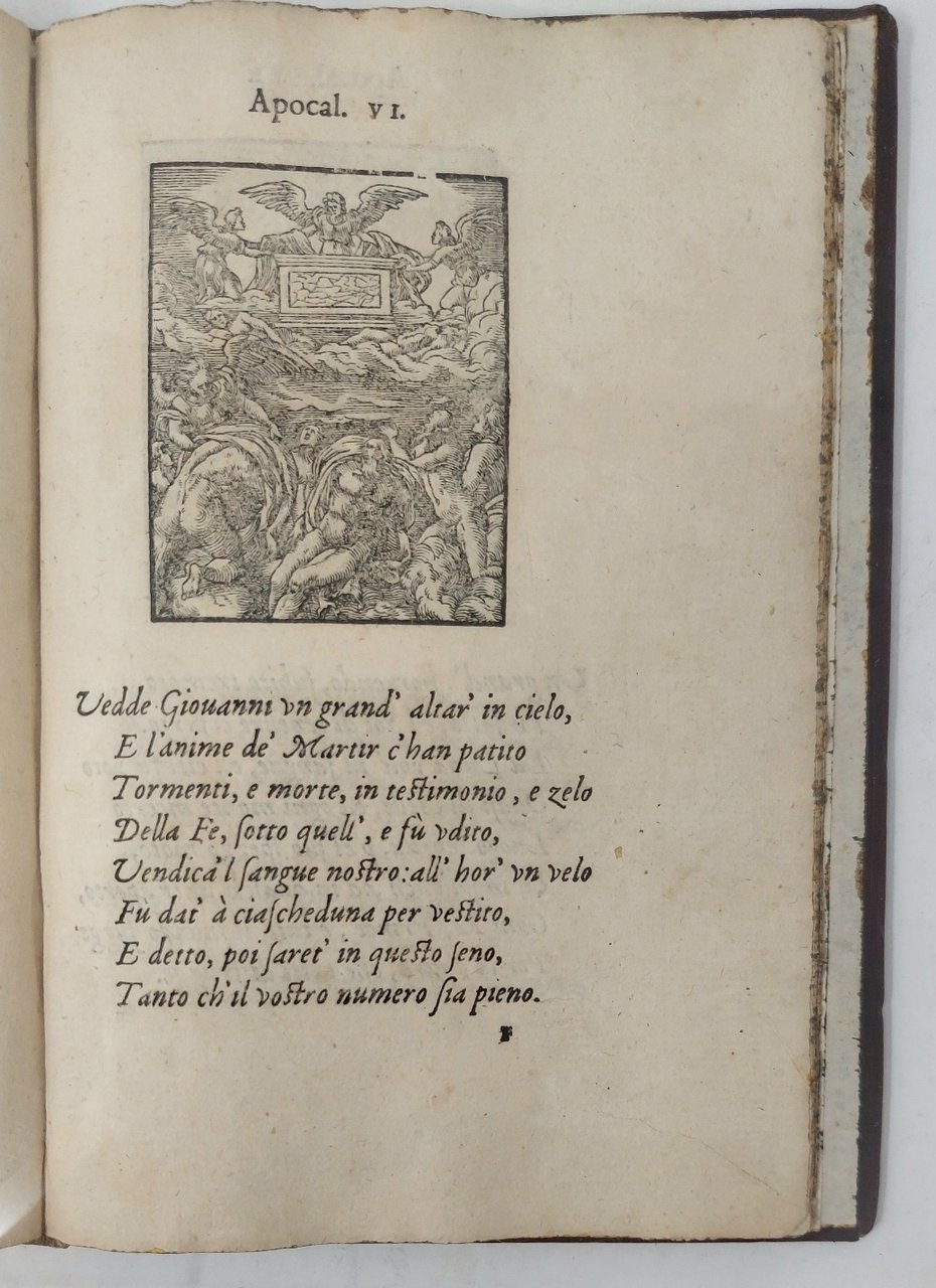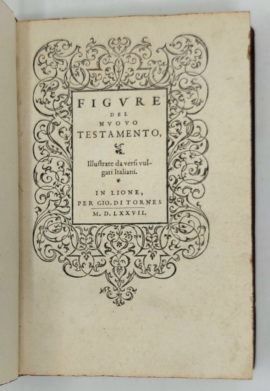 >in-8 (175x125 mm), ff. 52 nn. Ottima legatura 800sca d'amatore in marocchino rosso cupo, filett. a secco e dorati, fiori agli angoli sui piatti, dorso a nervi ornato, tagli dor., titolo e data sui due piatti. Bel carattere corsivo per i versi in italiano di Damiano Maraffi, car. tondo per il titolo e la dedica a Margherita di Francia duchessa di Berry. Famosa serie di 95 incisioni in legno di Bernard Salomon, pittore, illustratore, incisore (Lyon 1510-1561), di grande finezza, già apparse in alcune precedenti edizioni lionesi in latino, francese e italiano, dal De Tournes a partire dal 1554. Il titolo del delizioso volumetto è racchiuso in una bordura arabescata assai bella. I legni sono impressi uno per pagina, sopra le 8 linee di testo; le silografie dell'Apocalisse sono copie ingrandite di quelle di Janot, "but the cumulative effect of Salomon's carefully detailed scenes is that of an individual contribution to Bible illustration" (Mortimer). Raro, bell'esemplare marginoso. Praz, p. 271. Mortimer, Harvard Frech, I, p.1099. Bénézit, XII, 224-225.