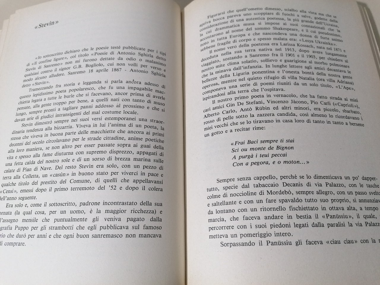 in 8^, pp. 252, bross. edit. ill., ritratto dell'A. in antip. Collana di autori sanremaschi, vol. II^, a cura di Franco d'Imporzano. Raccolta di scritti illustrati dalle caricature dell'A. e dalle foto b/n di Aldo Devoto. Discrete condizioni compatibilmente con i segni dell'età.