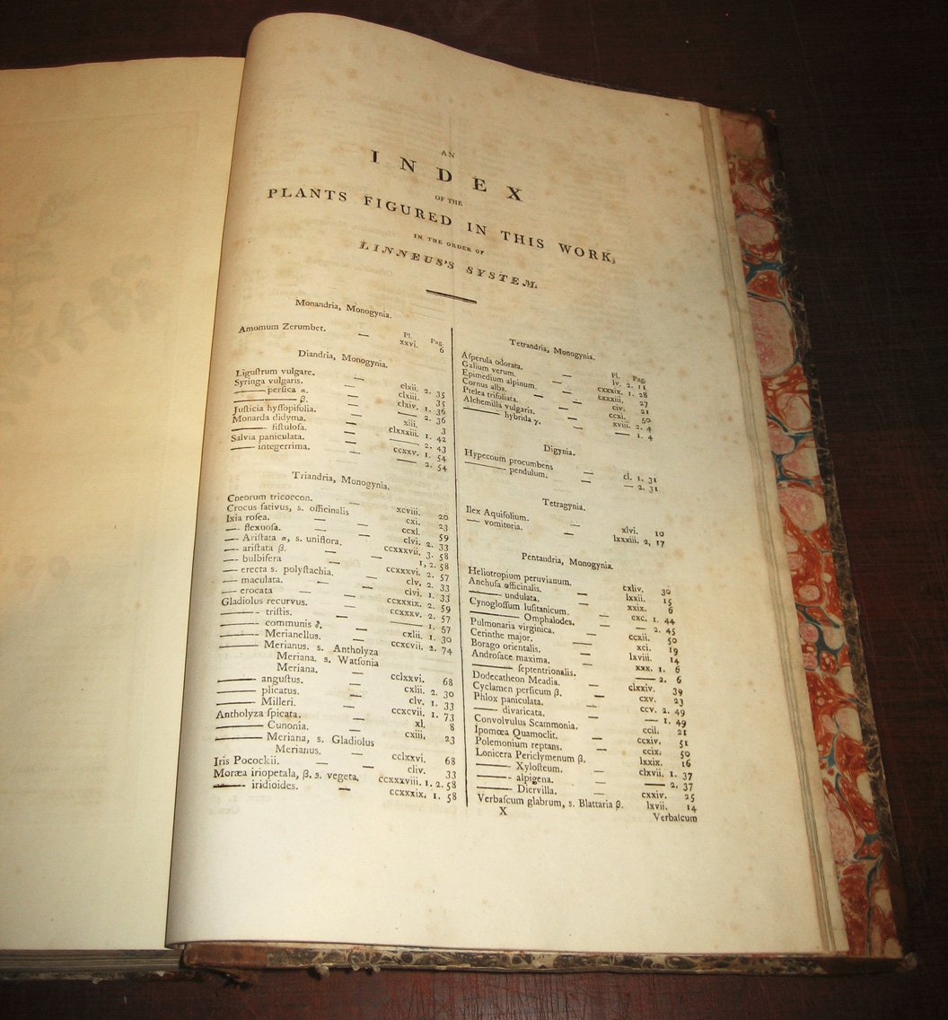 >2 tomi in un volume in-folio (420x280 mm.), legatura coeva mezza pelle e ang. Terza edizione (prima 1771) di uno dei grandi libri di botanica. Composto da 300 stupende tavole a piena pagina di fiori, incise in rame con brillanti colori di base e ritoccate a mano nel laboratorio dello stampatore. Accompagnate da fogli di testo descrittivo e indici. Le incisioni furono tratte dai disegni di William Houston, George D. Ehret, John Miller, ed altri artisti. Magnifica opera botanica. Nissen 1378. Great Flower Books p.68. Dunthorn 209. Hunt 566. Stafleu TL2 6059.