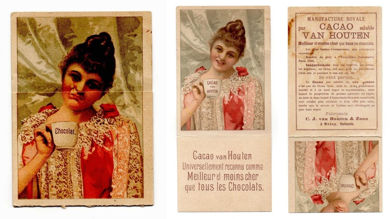 Figurina Pubblicitaria Cacao Van Houten - Manifacture Royale, primi '900. Splendida Figurina Cromolitografica Animata. Chiusa 7,5x10 - Aperta 7,5x16. Rara, Ottimo stato. ,