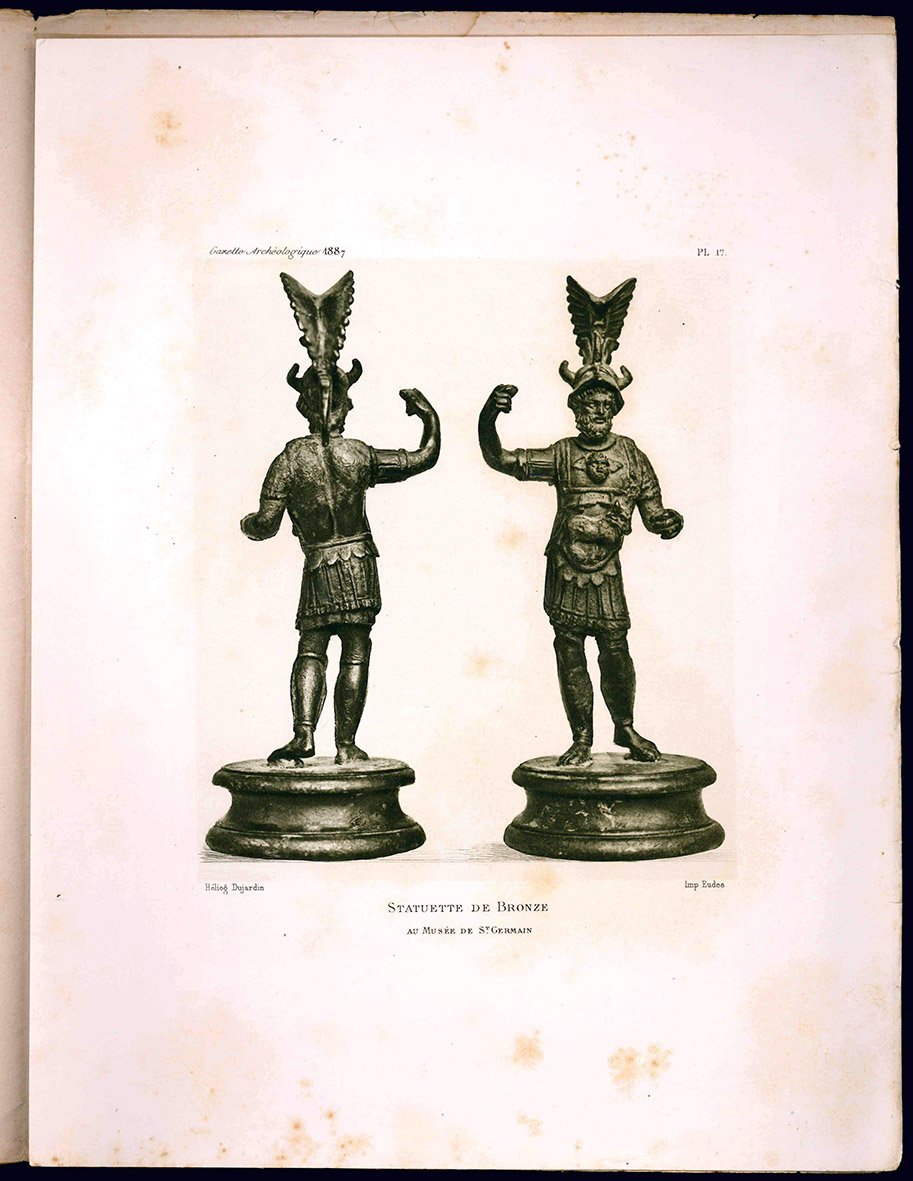 Figurine de bronze coiffée d'un casque cornu. (Extrait de la Gazette archéologique de 1887).