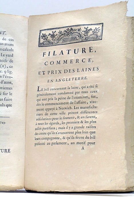 in-8. XXVIII. 292pp. (22x14 Cm). Broché, couverture de l'époque. Traduction française de l'ouvrage "The Question of Wool truly stated" de 1788. Il s'agit d'une correspondance entre l'agronome réformateur Arthur Young, le botaniste Joseph Banks et plusieurs grands propriétaires anglais. Le livre est un pamphlet contre le projet de loi visant à renforcer l'interdiction de l'exportation de la laine, le Wool Bill. Les auteurs témoignèrent devant les deux chambres du Parlement mais la loi fut tout de même adoptée, provoquant la colère des partisans de Young à Norwich qui se retournèrent contre lui et brûlèrent son effigie. Cette première édition française fut traduite par C. Pinel.