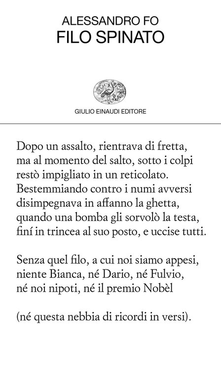 Il filo spinato del titolo è quello che, trattenendo il nonno di rientro da un assalto durante la Grande Guerra, gli salvò la vita. Senza quel filo non ci sarebbero stati il padre del poeta, né la zia Bianca, né lo zio Dario, né il premio Nobel di quest'ultimo. Incontriamo poi in questo libro un ricco romano del IV secolo, di cui rimane pressoché solo il nome: ma fu grazie a lui se il giovane Agostino poté studiare. Senza di lui, niente Confessioni. E poi, ancora, una borsetta di perline trovata fra le macerie della Seconda guerra mondiale e conservata durante la prigionia per essere regalata a una futura nipote, che ora l'ha riposta così gelosamente da non riuscire più a trovarla. La consolazione di un declivio fiorito lungo la strada che conduce a un lavoro logorante. Una pagella del 1934, nella quale un 6 in matematica fa ancora recriminare dopo più di ottant'anni l'alunna che lo ricevette. Un garage da sgomberare, in cui giace un tesoro di lettere di Ripellino. L'avvento salvifico di vecchi libri sbrindellati nella cella di una prigione. Le poesie di Alessandro Fo raccontano piccoli episodi come ripresi da vecchie foto, sempre con la speranza che qualcosa resti, dopo la fine di ogni storia. Sempre con la certezza che tra lo scomparire e il riemergere ci sia un filo sottile, spinato o no, a cui tutti siamo appesi.