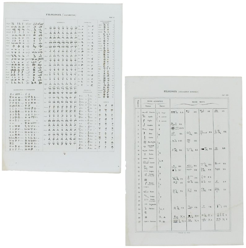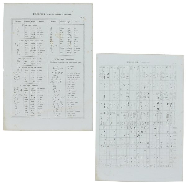 (Codice LG/1675) Le 9 tavole (29,5x21,5 cm) illustrate con incisioni in rame: vari alfabeti, caratteri cuneiformi, scrittura demotica, geroglifici fonetici, ecc.Tavole ORIGINALI, provengono da un volume sciolto. Ottimo stato. A garanzia dell'autenticità, alleghiamo fotocopie di: frontespizio, prefazione (10 pp.) e indice sistematico delle tavole con elenco delle incisioni. ~~~ SPEDIZIONE IN ITALIA SEMPRE TRACCIATA