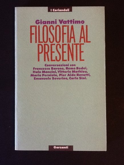 Conversazioni con Francesco Barone, Remo Bodei, Italo Mancini, Vittorio Mathieu, Mario Perniola, Pier Aldo Rovati, Emanuele Severino, Carlo Sini. Fuori catalogo<br/>Collana I CORIANDOLI<br/>Legatura brossura editoriale<br/>Formato Sedicesimo<br/>Num Pagine 125<br/>Prima Edizione