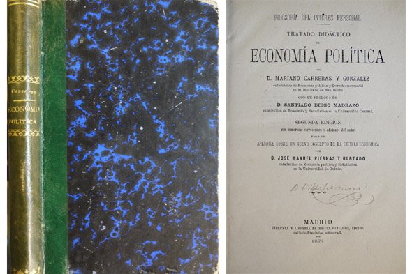 Madrid, Imprenta y Librería de Miguel Guijarro, Editor, 1874. 4to. alargado; 3 hs., XL pp., 534 pp., 1 h. Encuadernación de época, en media piel. El catecismo de la práctica liberal económica española tradicional, siempre necesitado de revisión. Carreras y González, nacido en Morata de Jalón, Zaragoza, abogado y médico, fue sucesivamente Administrador de la Imprenta Nacional, Intendente General de Filipinas y Director del Banco de Almería, pero su decisiva relevancia radica en el hecho de que fue el mayor especialista en temas económicos en las Cortes de la Restauración.