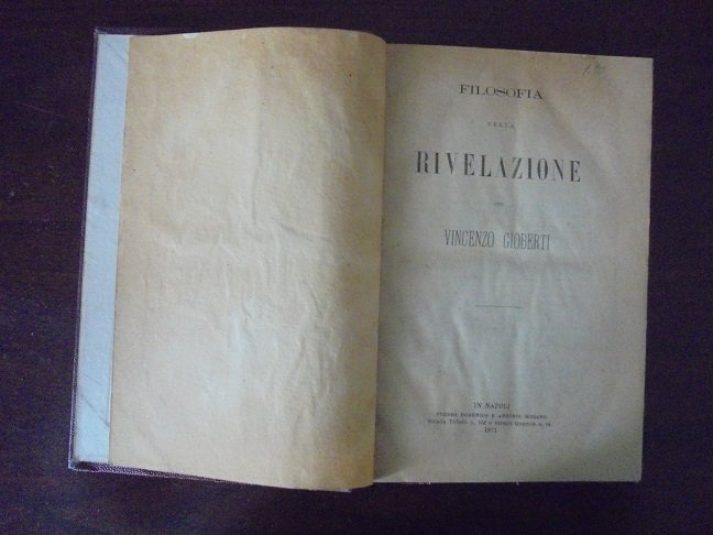 In 8∞: pp. 216. Leg. stanca in mz. tela non edit.,timbro alla sguardia. fioriture sparse. Dall`indice: Dell`Atto creativo. Del Sovrannaturale. Della Fede. Del Dogma. Della Religione. Della Rivelazione. Del Cristianesimo, ecc. ecc.