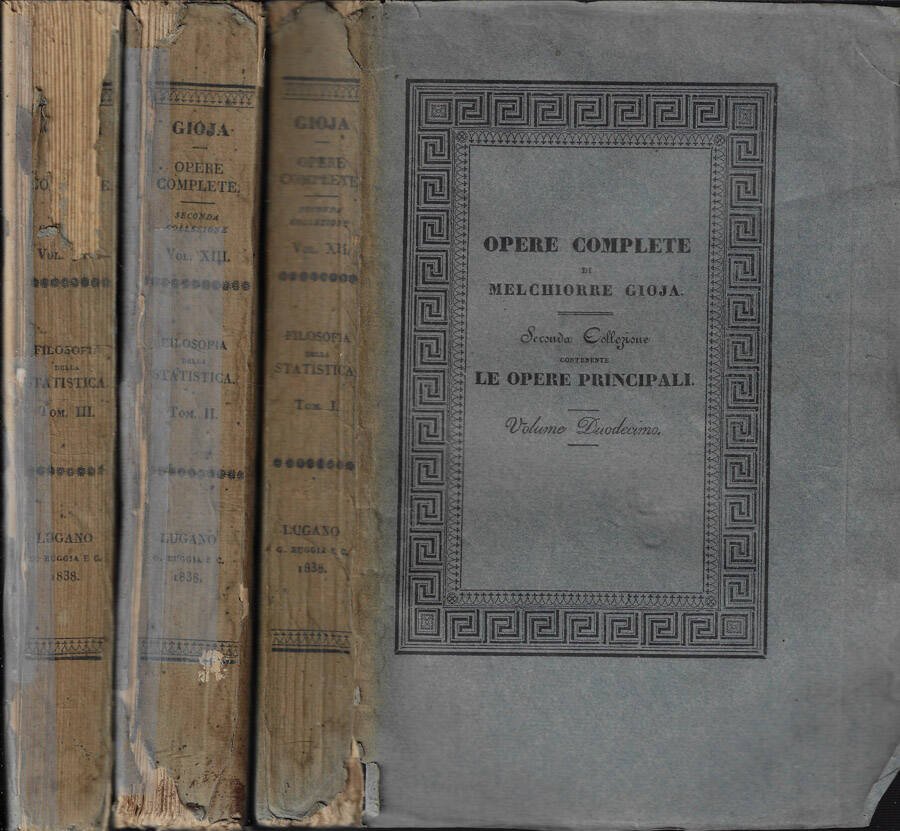 Opera completa in tre volumi, rispettivamente numero 12-13-14 della seconda collezione delle Opere complete di Melchiorre Gioja. Brossura in cartoncino, segnata dal tempo, scurita in particolare al dorso, con strappetti alle cerniere , piccole mancanze, leggeri aloni causa umidità, scotch trasparente di sostegno ed usura ai margini. Pagine vissute, con tagli irregolari, legatura leggermente allentata in più parti e gore sparse. Numero complessivo di pagine 1385 (398-531-456).