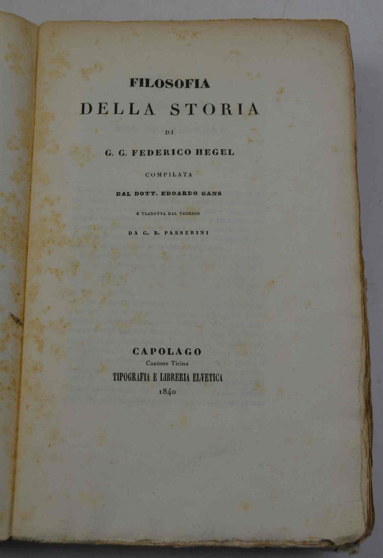 Filosofia della storia di G.G. Federico Hegel compilata dal dott. Edoardo Gans tradotta dal tedesco da G.B. Passerini.