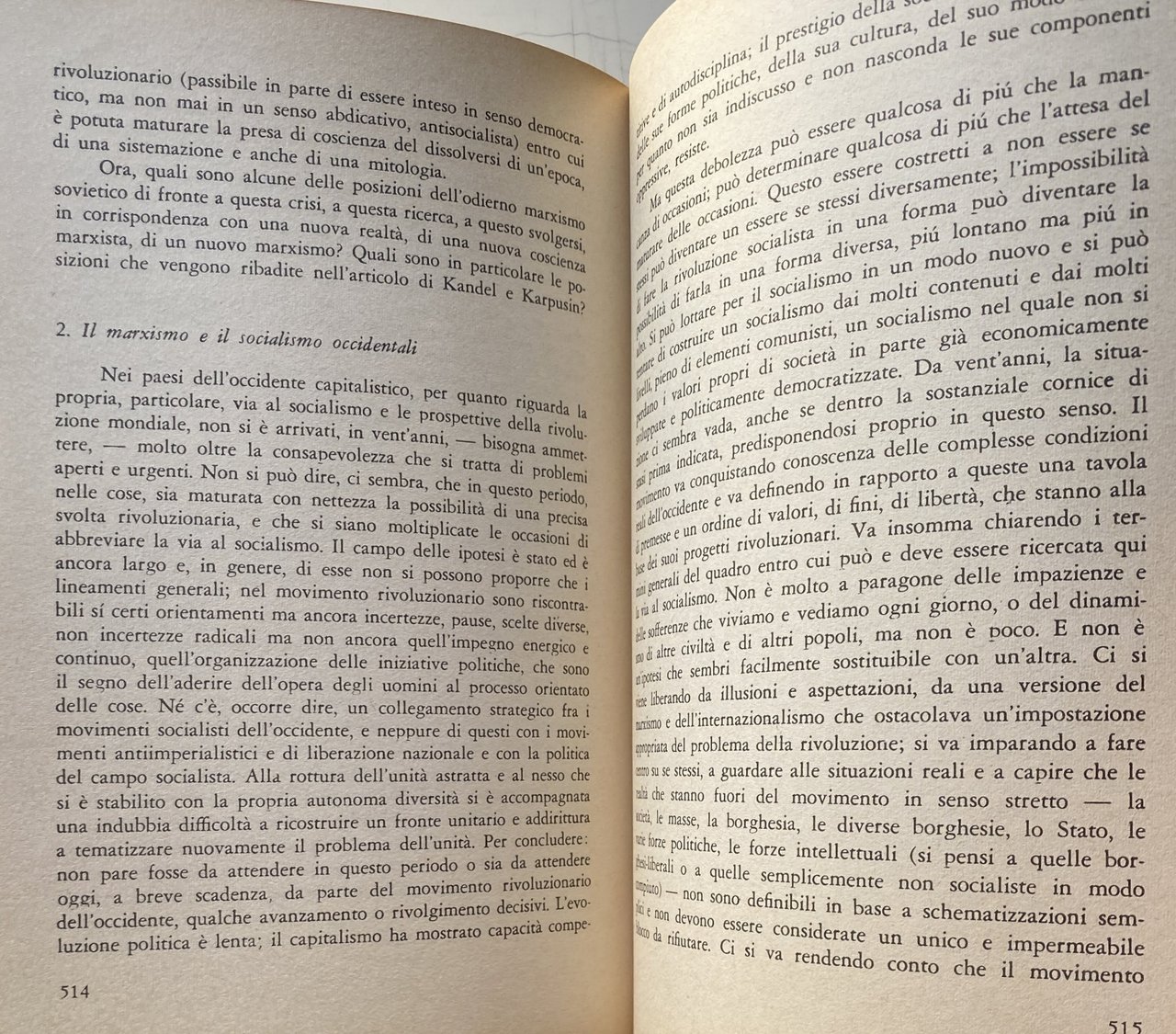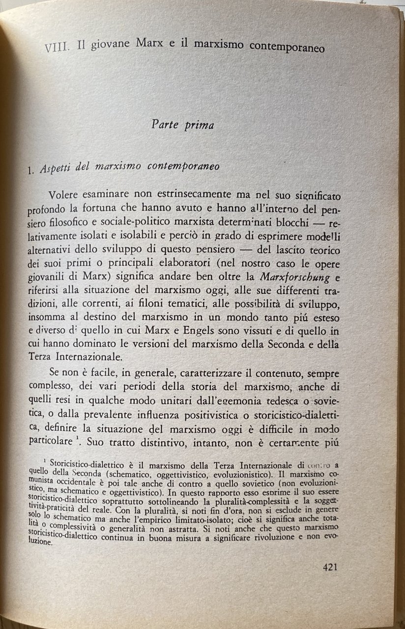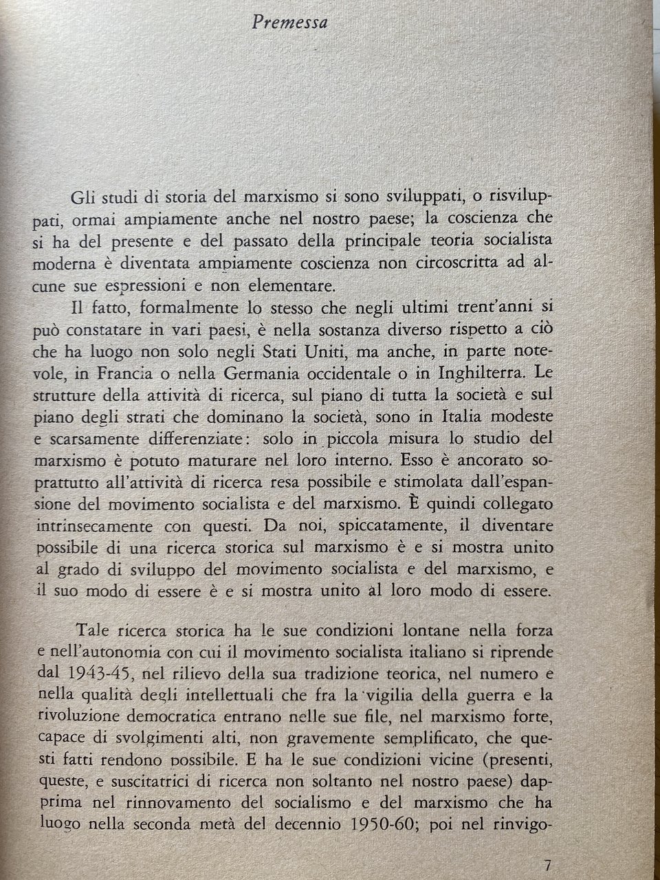 Premessa. Gli studi di storia del marxismo si sono sviluppati, o risviluppati, ormai ampiamente anche nel nostro paese; la coscienza che si ha del presente e del passato della principale teoria socialista moderna è diventata ampiamente coscienza non circoscritta ad alcune sue espressioni e non elementare. Il fatto, formalmente lo stesso che negli ultimi trent'anni si può constatare in vari paesi, è nella sostanza diverso rispetto a ciò che ha luogo non solo negli Stati Uniti, ma anche, in parte notevole, in Francia o nella Germania occidentale o in Inghilterra. Le strutture della attività di ricerca, sul piano di tutta la società e sul piano degli strati che dominano la società, sono in Italia modeste e scarsamente differenziate: solo in piccola misura lo studio del marxismo è potuto maturare nel loro interno. Esso è ancorato soprattutto all'attività di ricerca resa possibile e stimolata dall'espansione del movimento socialista e del marxismo. È quindi collegato intrinsecamente con questi. Da noi, spiccatamente, il diventare possibile di una ricerca storica sul marxismo è e si mostra unito al grado di sviluppo del movimento socialista e del marxismo, e il suo modo di essere è e si mostra unito al loro modo di essere. Tale ricerca storica ha le sue condizioni lontane nella forza e nell'autonomia con cui il movimento socialista italiano si riprende dal 1943-45, nel rilievo della sua tradizione teorica, nel numero e nella qualità degli intellettuali che fra la vigilia della guerra e la rivoluzione democratica entrano nelle sue file, nel marxismo forte, capace di svolgimenti alti, non gravemente semplificato, che questi fatti rendono possibile. E ha le sue condizioni vicine (presenti, queste, e suscitatrici di ricerca non soltanto nel nostro paese) dapprima nel rinnovamento del socialismo e del marxismo che ha luogo nella seconda metà del decennio 1950-60; poi nel rinvigorimento che socialismo e marxismo esperiscono verso la fine del decennio 1960-70. Sono essenzialmente questi i dati e i processi che, sia pure in gradi diversi, producono in Italia le sollecitazioni maggiori a prendere coscienza della storia del marxismo in forme che tengono conto delle sue reali, vaste, dimensioni e in forme analitiche e critiche.