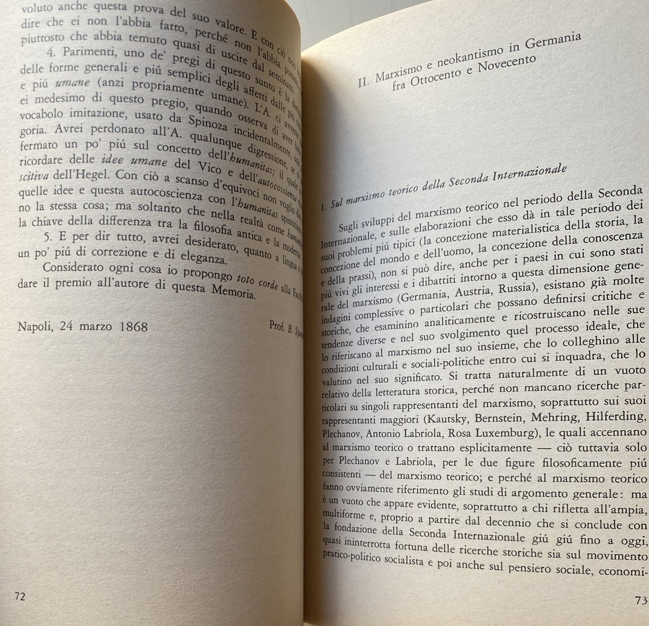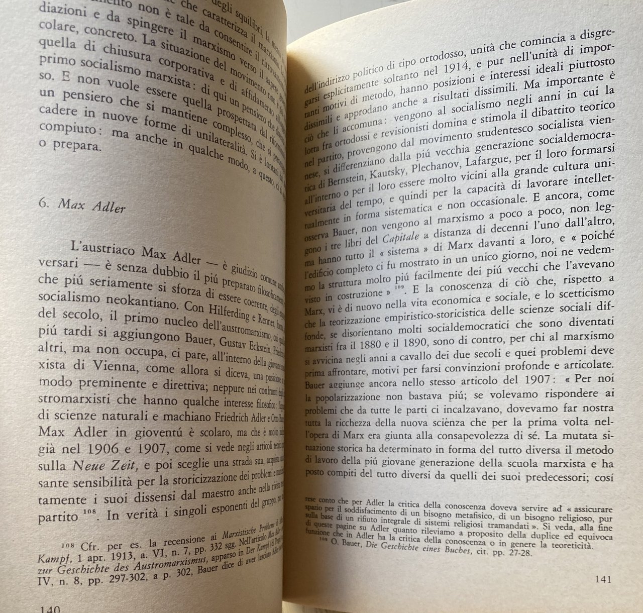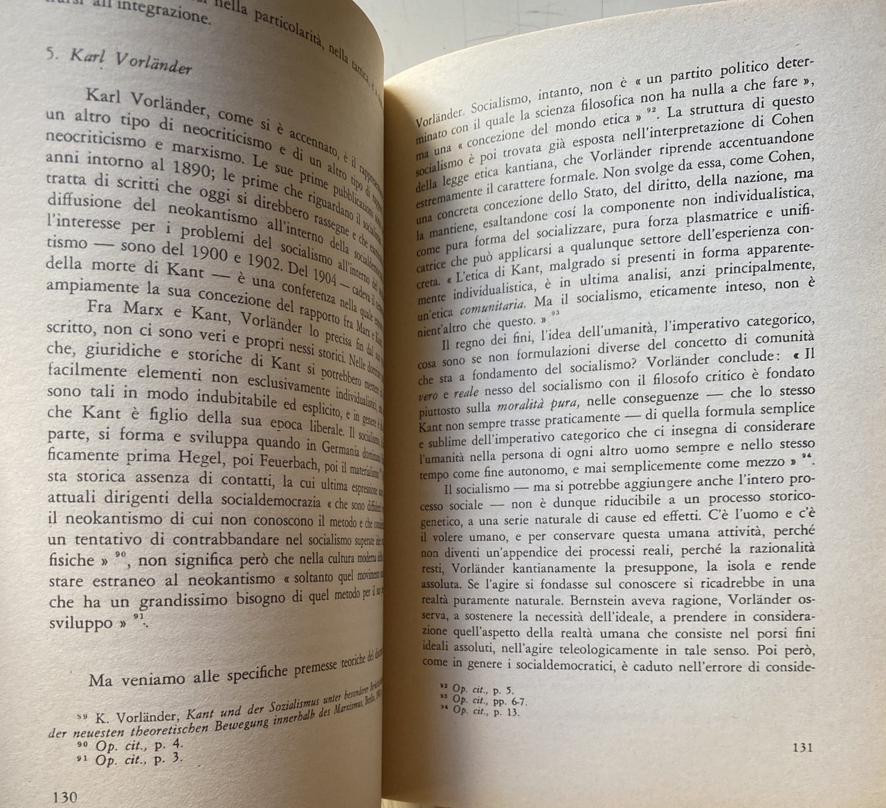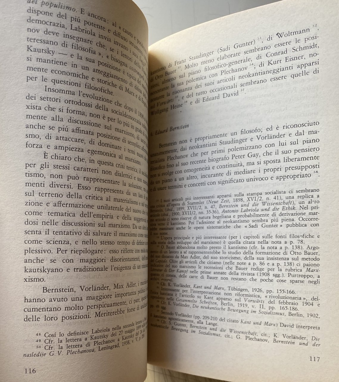 Soggetti: Ideologie politiche, Socialismo, Filosofia, Sinistra, Partiti politici, Ideologia, Pensiero, Storia, Novecento, Lavoro, Diritti sociali, Teorie, Arturo Labriola, Spinoza, Metodo storico, Spinozismo Capitalismo Imperialismo Marxismo Neokantismo Germania Ottocento Idealismo tedesco Seconda Internazionale Eduard Bernstein, Karl Vorländer Max Adler Anni Venti Anni Trenta 1920-30 Lukács Korsch Marcuse Antonio Gramsci Bucharin Comunismo Russia Rivoluzione Unione Sovietica Guerre mondiali Guerra Europa Socialdemocrazia Stato Critica marxista Manuale Antonio Banfi Feuerbach Umanismo Grundrisse Manifesto Engels Heidegger Löwith Materialismo storico Cecoslovacchia Ricerca Scritti giovanili Etica Morale Questione ebraica Ebrei Antisemitismo Relazioni internazionali Saggi Libri rari Vintage fuori catalogo Collezionismo Bibliografia Riferimento Stalinismo Leninismo Riformismo Sindacalismo Sindacati Fascismo Repressione Censura Lotta di classe Movimento operaio Sciopero Fabbriche Riforma agraria Contadini Industria Coscienza Autonomia Economia Proletariato Resistenza Programma Costituzione Congresso Parlamento Dirigenti Dittatura Antonio Rosmini Erich Fromm Antidühring Scissione Livorno Borghese Borghesia Liberalismo Liberale Sabino Fiorese Gunnar Myrdal György Lukács Habeas corpus Hegel Pianificazione Messi Bisogni Alienazione Dialettica Produzione Surplus Proprietà privata Ricchezza Uguaglianza Tecnologia Sviluppo Saint-Simon Libertà Owen Fourier Babeuf Bruno Leoni Riformatori Filantropia Felicità Utopisti Utopia Società Diritto Adler Bucharin Bernstein Otto Bauer Cornu Benedetto Croce Bobbio Bloch Blum Actis Perinetti Cantimori Habermas Feuerbach De Man Gioacchino Della Volpe Bo Deborin Del Pra Fischer Eugenio Garin Fogarasi Heidegger Herbart Hoeppner Kandel Kant Karpusin Lange Landshut Kautsky Karpusin Curiel Heinrich Cunow Lobkowicz Mehring Merleau-Ponty Rosa Luxemburg Mayer Lowith Plechanov Rickert Paolo Rossi Rusconi Russell Spinoza Stammler Bertrando Spaventa Sorel Schmidt Sombart Schaff Sartre Pazitnov Ricardo Stirner Tugarinov Weber Storia contemporanea Intellettuali Studi gramsciani Rivista Mondolfo Franco Lombardi Humana Actiones Terza Internazionale Cooperazione Collettivismo Competizione Individualismo Eguaglianza sociale Proudhon Welfare Anarchismo Kropotkin Revisionismo Giacinto Menotti Serrati Fascismo Stato Mercato Political ideologies Socialism Philosophy Left-wing Political parties Ideology Thought History Twentieth century Work Social rights Theories Historical method Capitalism Imperialism Germany Nineteenth century German idealism Second International Twenties Thirties Communism Revolution Soviet Union World Wars Europe Social democracy State Marxist criticism Manual Humanism Historical materialism Czechoslovakia Research Youth writings Ethics Jewish question Jews Anti-Semitism International relations Essays Rare books out of print Collecting Bibliography Reference Stalinism Leninism Reformism Trade unionism Fascism Repression Censorship Class struggle Workers' movement Strike Factories Agrarian reform Peasants Industry Consciousness Autonomy Economy Proletariat Resistance Program Constitution Congress Parliament Managers Dictatorship Split Bourgeois Bourgeoisie Liberalism Planning Needs Alienation Dialectics Production Private property Wealth Equality Technology Development Freedom Reformers Philanthropy Happiness Utopians Society Law Contemporary history Intellectuals Studies Magazine Collecting Third International Cooperation Collectivism Competition Individualism Social equality Anarchism Revisionism State Market