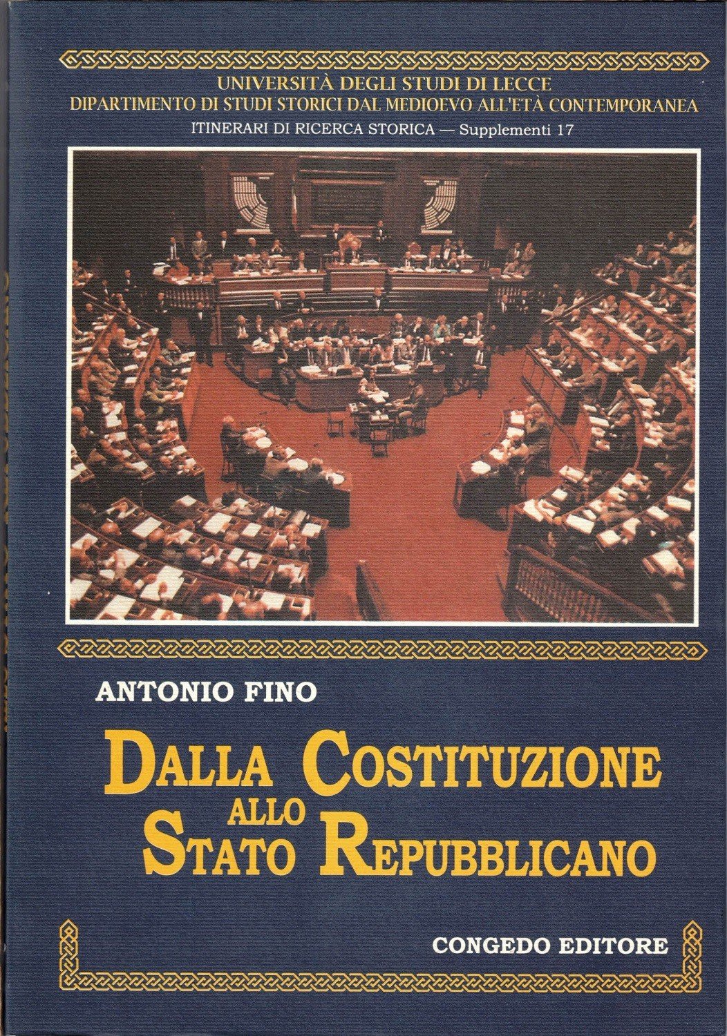 Antonio Fino, Dalla Costituzione allo Stato Repubblicano. Momenti e problemi dell’Italia degasperiana, Congedo Editore, Galatina 2000, pp. 197, cm 25, br. ed. con alette. Università degli Studi di Lecce. Pubblicazioni del Dipartimento di studi storici dal Medioevo all’Età Contemporanea. Collana Itinerari di ricerca storica. Serie Supplementi, vol. 17. Indice: Introduzione – Capitolo I. Il problema della stabilità di governo e dell’efficienza parlamentare nella prima legislatura repubblicana (Ritardi e persistenze nella più recente storiografia – L’inizio della legislatura tra dubbi e incertezze- Le esperienze degli altri sistemi politici occidentali – Il dibattito sui problemi di governo in Italia) – Capitolo II. Giuristi cattolici e funzioni dello Stato agli inizi degli anni Cinquanta (La relazione Dossetti – La relazione Moro – La relazione Romani – La relazione Prosperetti – La relazione Baget Bozzo – La relazione Amorth – Il dibattito – La replica finale di Dossetti – La relazione La Pira) – Capitolo III. Alle origini della cosiddetta legge truffa: la riforma elettorale amministrativa del 1951 (Una nuova legge elettorale per il rinnovo dei Consigli Comunali – I partiti minori e la difesa della proporzionale – I risultati della I Commissione della Camera – La ripresa delle trattative – La paternità della base di intesa – I primi commenti – Il dibattito alla Camera dei Deputati – La discussione al Senato) – Indice dei nomi. Minime fioriture ai tagli, leggera ingiallitura della carta, per il resto perfetto.