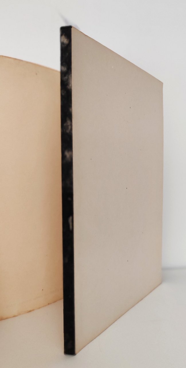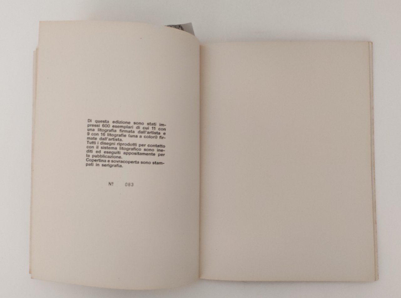 Sovraccoperta editoriale in condizione accettabili con aloni e fioriture ai piatti e al dorso, uno strappo di centimetri 4 al margine superiore del piatto anteriore, tagli bruniti, legatura rigida muta con dorso in tela nero con alcune macchie, vedere immagini, fogli di guardia colorati, pagine non numerate dimensioni cm 23,1 * 16,8 copia numero 83 di 600