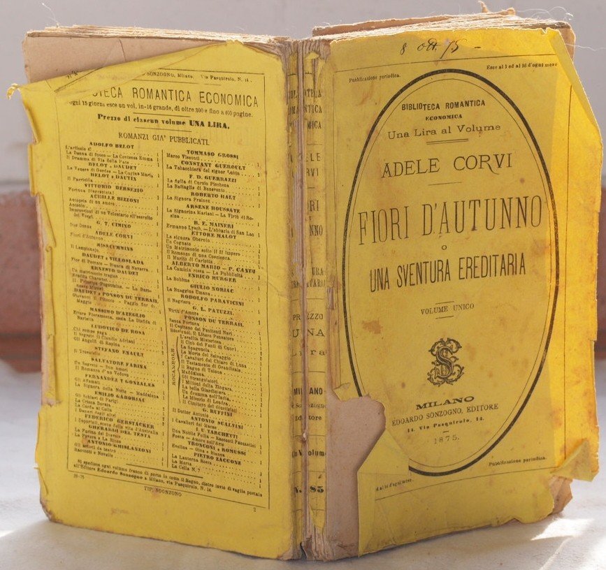 In 8. Dim. 19x12,5 cm. Pp. 322. Edizione del 1875 di questo romanzo sentimentale della scrittrice Adele Corvi. Note manoscritte. L'opera è in un volume ed è completa. In discrete condizioni. Brossura editoriale in discrete condizioni generali con usure ai margini e dorso con rotture. Legatura in discrete condizioni con rotture. All'interno le pagine si presentano in buone condizioni con fioriture. Edition of 1875 of this pink novel by the writer Adele Corvi. Manuscripted notes. The work is in one volume and it is complete. In fair conditions. Editorial cover in fair general conditions with wearings in the edges and spine with cracks. Binding in fair conditions with cracks. Inside pages are in good conditions with foxings.