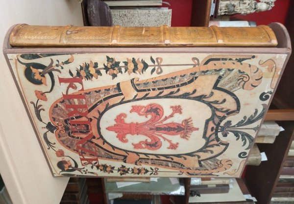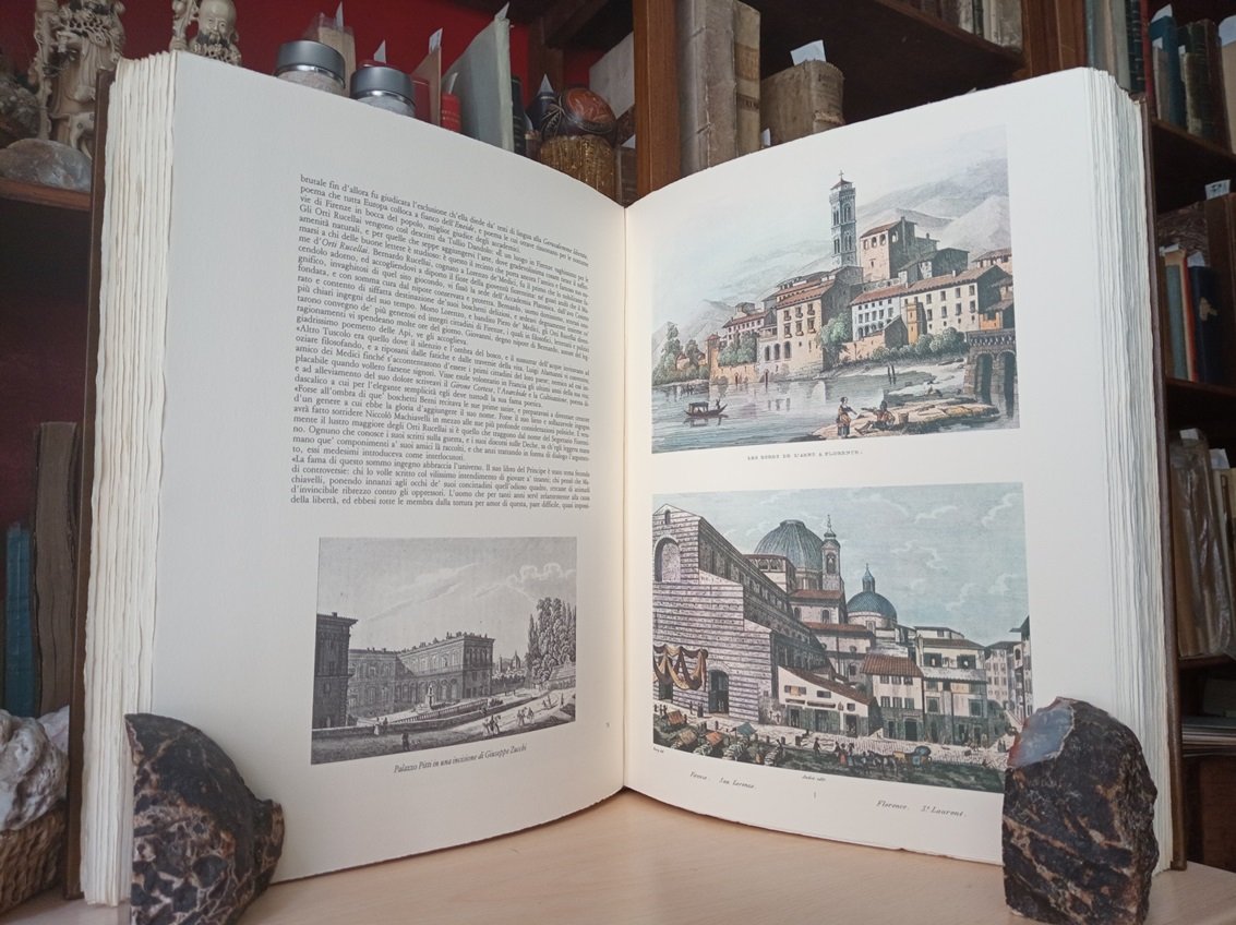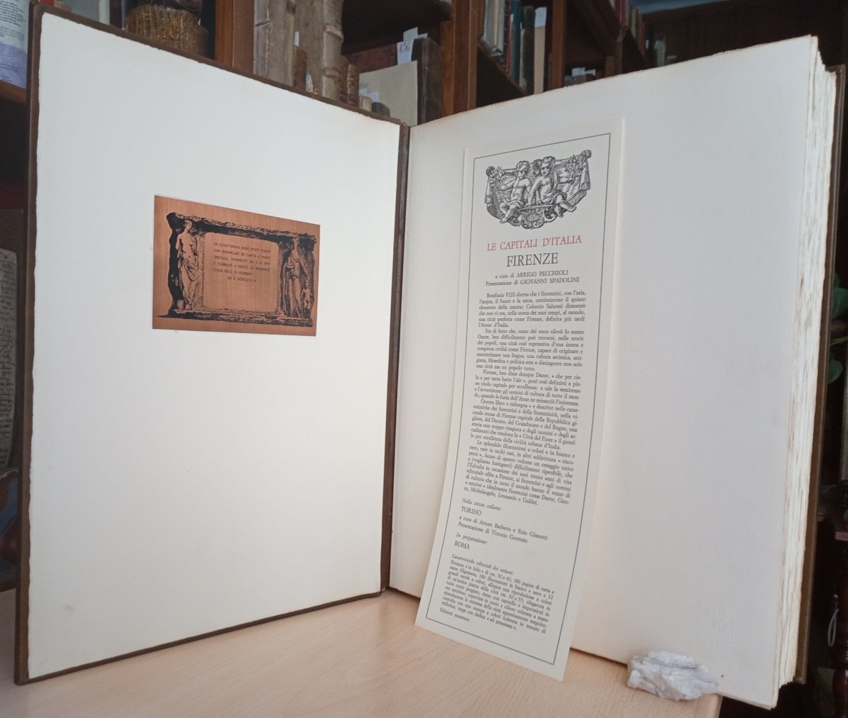 Volume in folio imperiale rilegato in pelle sbalzata e dipinta da Alberico ed Aristide Antinori su opera dello scultore Mario Picchi (la scritta FIRENZE insistente su giglio policromo affiancato da due putti), dorso a 5 nervi ornato, titolo al dorso, sguardie (presente la placchetta in bronzo, figurata, con la giustificazione della tiratura, del numero e della dedicatoria personalizzata, ancora senza i dati), occhiello, frontespizio stampato a due colori, 268 pp., occhiello degli indici, 4 cc., al verso dell'ultima colophon con giustifiocazione della tiratura e della numerazione (n 106, tiratura di testa).Splendido esempio di arte tipografica, il volume stato stampato su speciale carta a mano filigranata appositamente fabbricata dalla Cartiera Miliani Fabriano. Ricchissima l'iconografia in bianco e nero ed a colori (Calanchini, Interfotolito e Gamba di Roma). Il volume spazia da una visita nella citt datata 1847 ad un breve sunto dell'arte presente nei suoi scrigni (per forza sunto: non basta una vastissima biblioteca per descrivere appieno i tesori della citt gigliata), un escursus storico, gli ordini cavallereschi, le monete, il calcio fiorentino ed altro assai. I nomi degli estensori degli articoli sono di grandissima rinomanza. Lo spettacolare volume racchiuso in una custodia in tela e cartone con i due piatti decorati col giglio fiorentino e titolo alla costola. Perfetto, impeccabile.