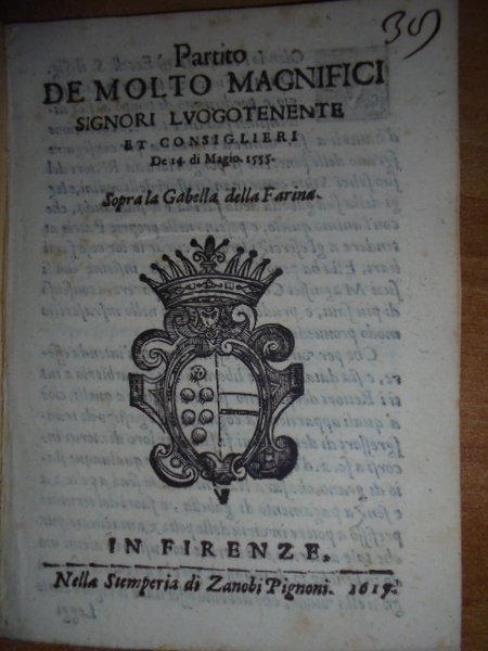 Bandi. PARTITO de molto Magnifici Signori Luogotenente et Consiglieri de 14 di Maggio 1555 sopra la gabella della farina. In Firenze, nella stamperia di Zenobi Pignoni, 1617. In-4° antico, cop. in varese. (4) pp. Arme ducale nel front. Opuscolo raro. Pac. 3. Mob. 3 Uff.