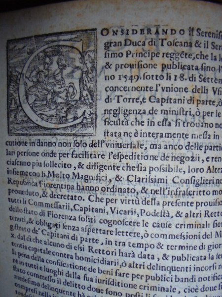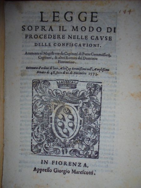 Bandi. LEGGE sopra il modo di procedere nelle cause delle confiscazioni. Attenente al Magistrato de Capitani di Parte, Comissarii, Capitani, & altri Rettori del Dominio Fiorentino. Ottenuta d' ordine di loro Altezze Sereniss. nell' Amplissimo Senato de 48 fatto il dì 11 di Dicembre 1573. Ristampa in Fiorenza, appresso Giorgio Marescotti. Stessa data. In-4° antico, cop. in varese. (6) pp., 1 f. bianco. Arme ducale incisa in legno nel front. Opuscolo. Pac. 3 Uff. Mob 3