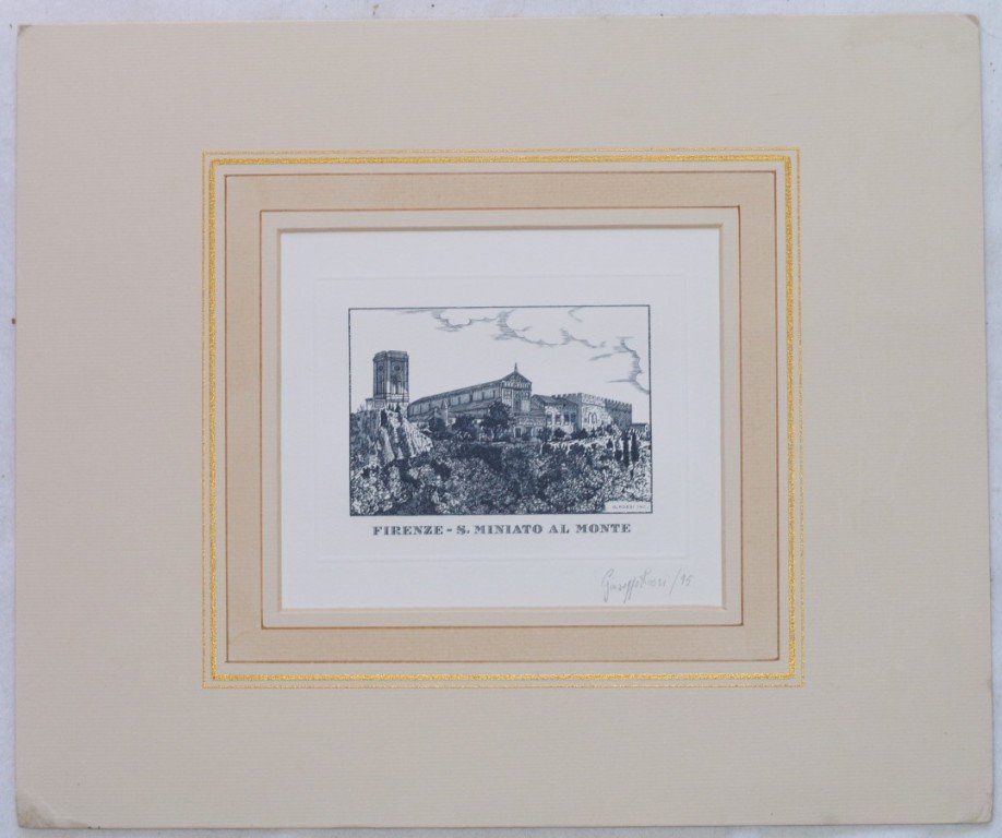 Splendida xilografia originale firmata a lapis dall'incisore Giuseppe Rossi datata 1995, che rappresenta la basilica di San Miniato al Monte di Firenze. Si trova in un elegante passepartout INCISIONE: Xilografia AUTORE: Giuseppe Rossi DIMENSIONI PASSEPARTOUT: cm 31x26 DIMENSIONI INCISIONE: cm 24x12,5 EPOCA: 1995 CONDIZIONI: Ottime. Faboulous original Woodcut signed with pencil by the engraver Giuseppe Rossi dated 1995, representing the Basilica of San Miniato al Monte in Florence. It is in an elegant passe-partout ENGRAVING: Woodcut AUTOR: Giuseppe Rossi PASSE-PARTOUT DIMENSION: cm 31x26 ENGRAVING DIMENSION: cm 24x12,5 DATE: 1995 CONDITIONS: very good.