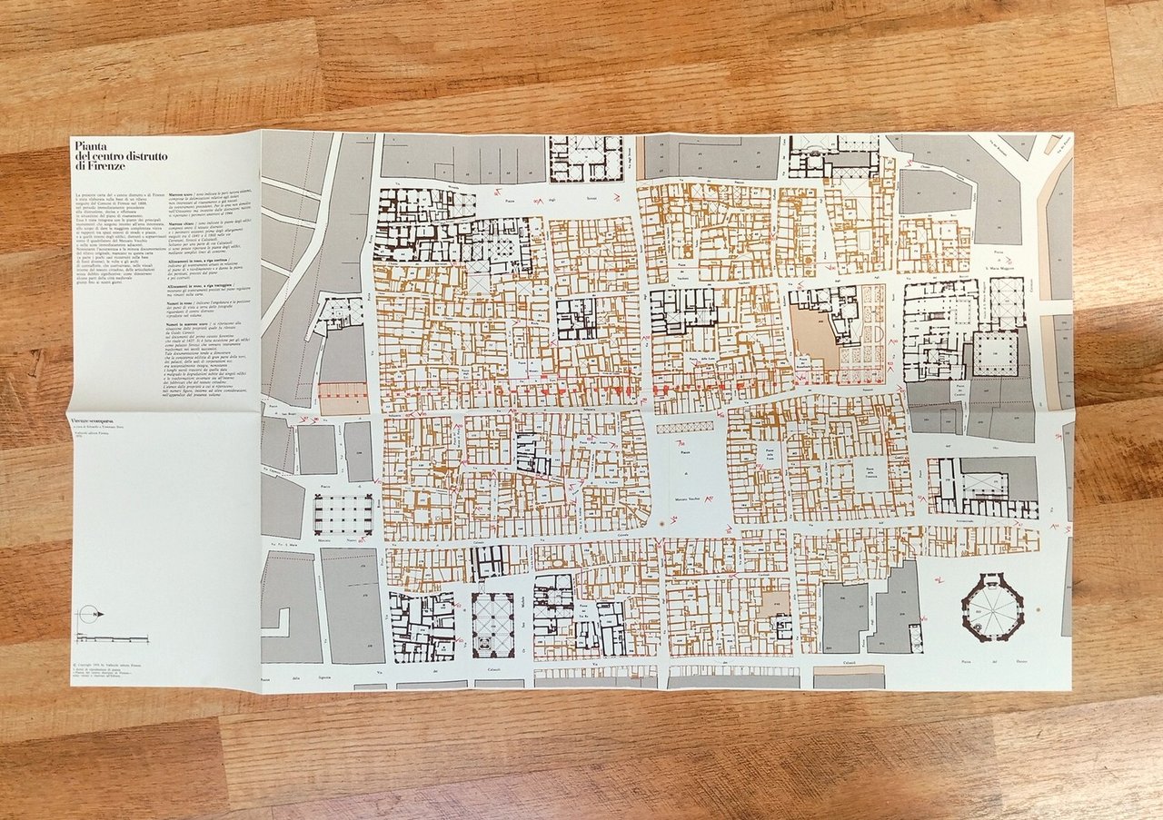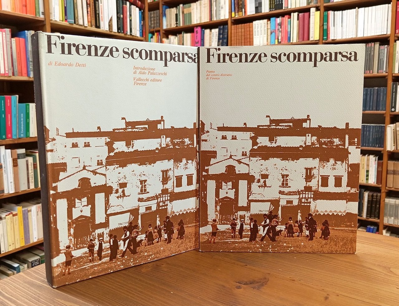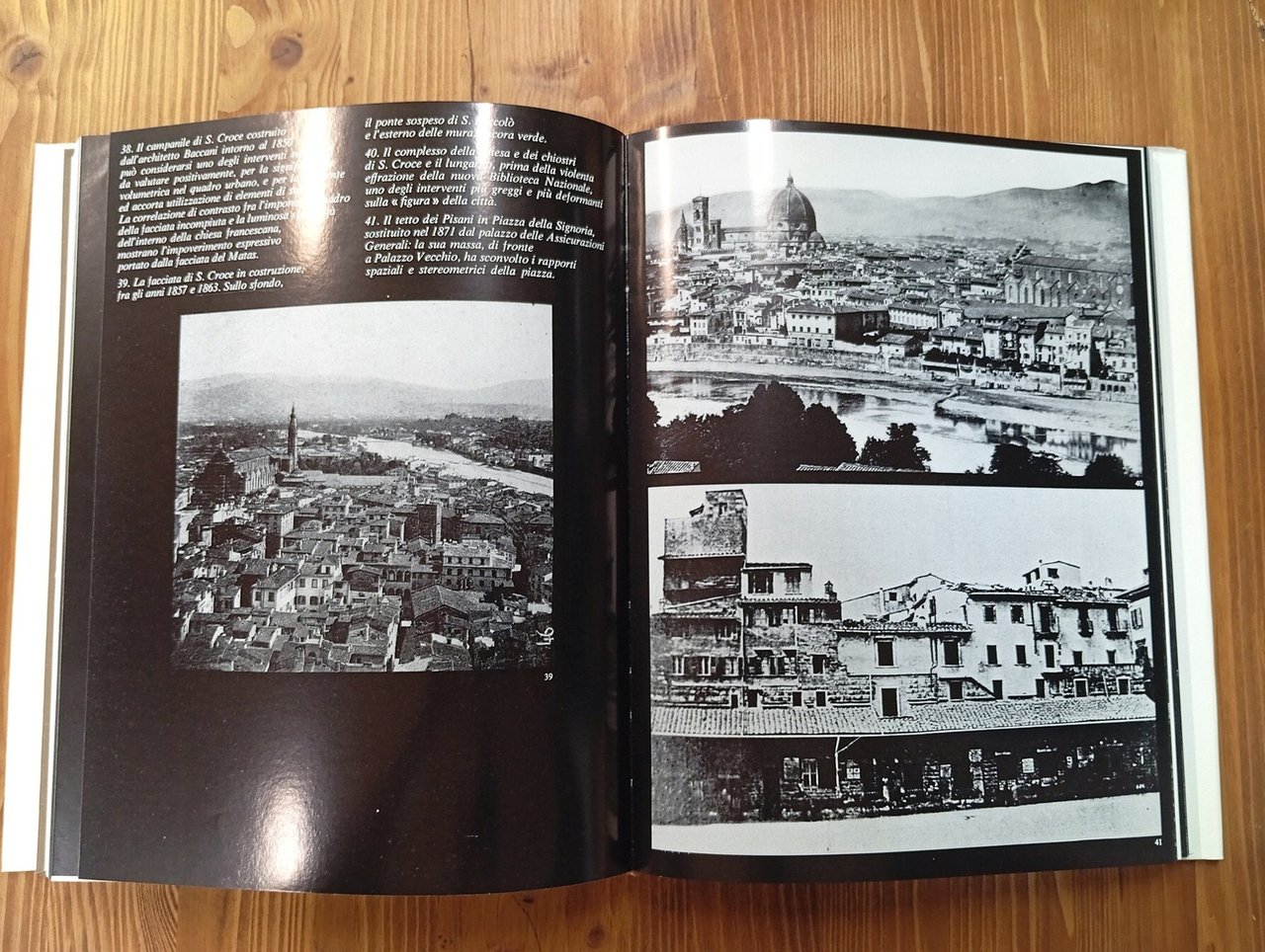Volume rilegato in tela editoriale con sovraccoperta, custodia rigida figurata, 169 pagine con numerose tavole fotografiche in bianco e nero fuori testo. A parte, ripiegata in apposita cartellina, una carta a colori di 55 x 100 cm ("Pianta del centro distrutto di Firenze"). Con la collaborazione di Tommaso Detti; introduzione di Aldo Palazzeschi. Opera in ottime condizioni.