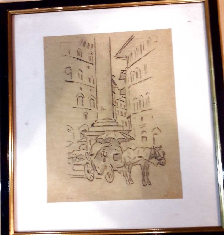Disegno a carboncino, cm. 23x18, montato su cornice a filo oro. Disegno non firmato ma con autentica sul retro: 'Piazza S. Trinità a Firenze 1908. Dall'album degli schizzi. Carboncino e matita del pittore macchiaiolo Alberto Micheli Pellegrini. Per autentica e origine , (Segue timbro, 'Archivio Conte Michele Pellegrini' Con sovrapposta firma autografa. -(Alberto Micheli Pellegrini, Livorno, 28 dicembre 1870 – Bibbiena, 7 gennaio 1943, è stato un pittore e illustratore italiano. Fu un pittore ritrattista e paesaggista ed un illustratore, appartenente alla corrente dei Postmacchiaioli, formatosi all'Accademia di belle arti di Firenze).